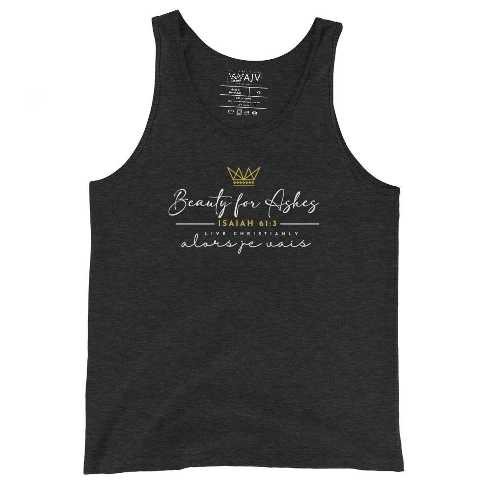 Elevate your wardrobe with BEAUTY FOR ASHES UNISEX TANK TOP (STYLE CLASSIC). This versatile style exudes confidence and gratitude, making a bold statement of trust in His word. It's designed for you, to express peace and trust in the reliability of His character, as He makes everything new. Stand out in style with this unique all-in-one piece.