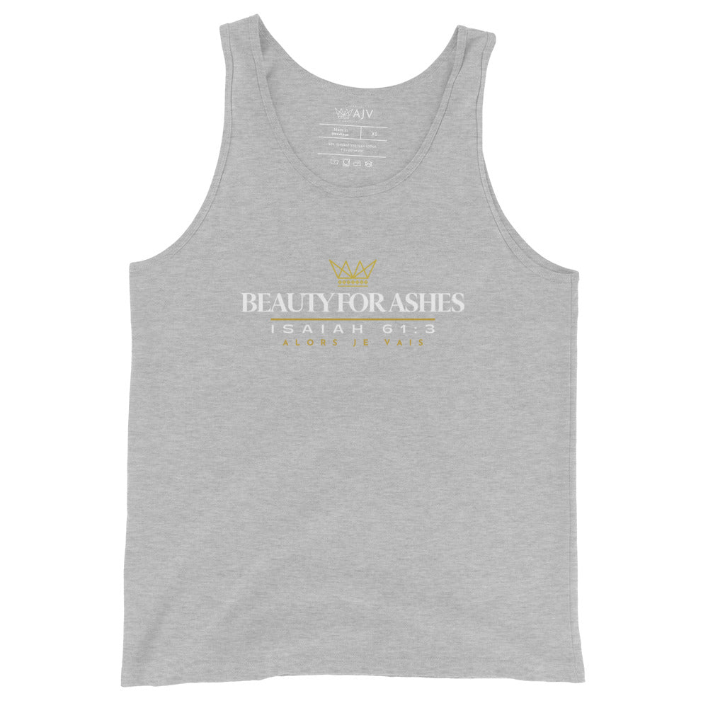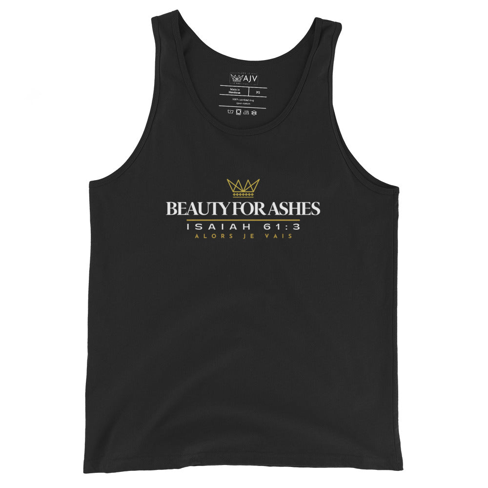 Elevate your wardrobe with BEAUTY FOR ASHES UNISEX TANK TOP (STYLE CLASSIC). This versatile style exudes confidence and gratitude, making a bold statement of trust in His word. It's designed for you, to express peace and trust in the reliability of His character, as He makes everything new. Stand out in style with this unique all-in-one piece.