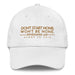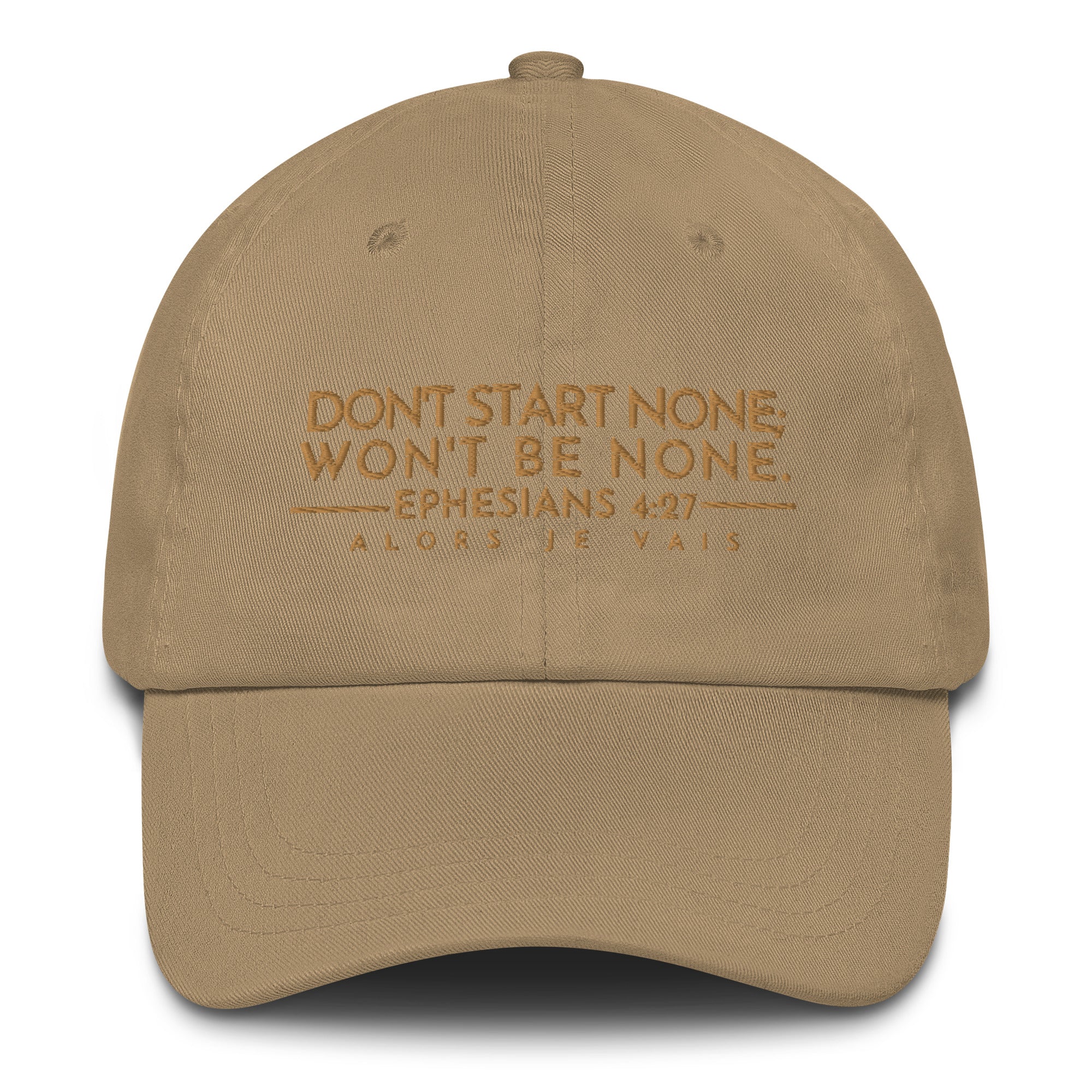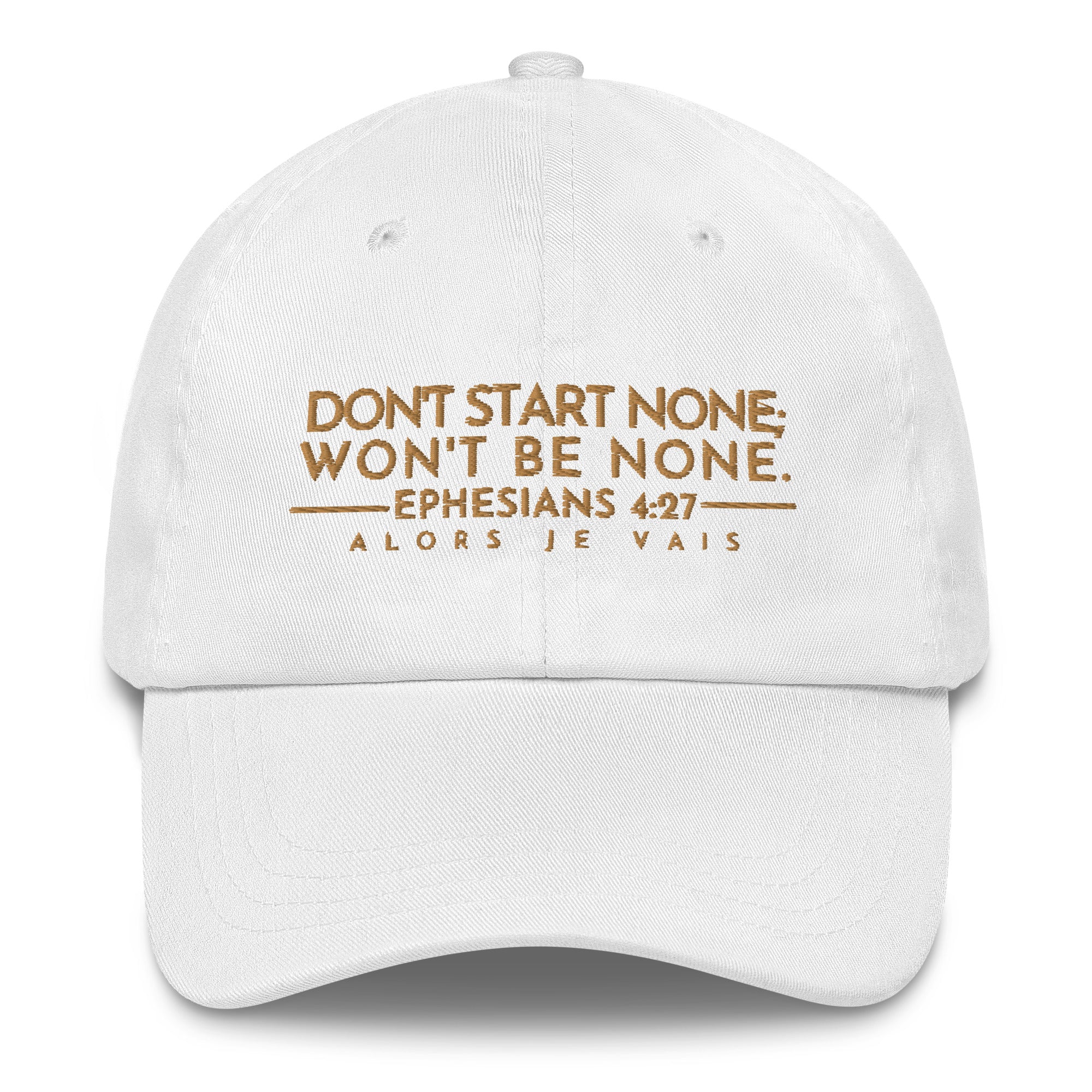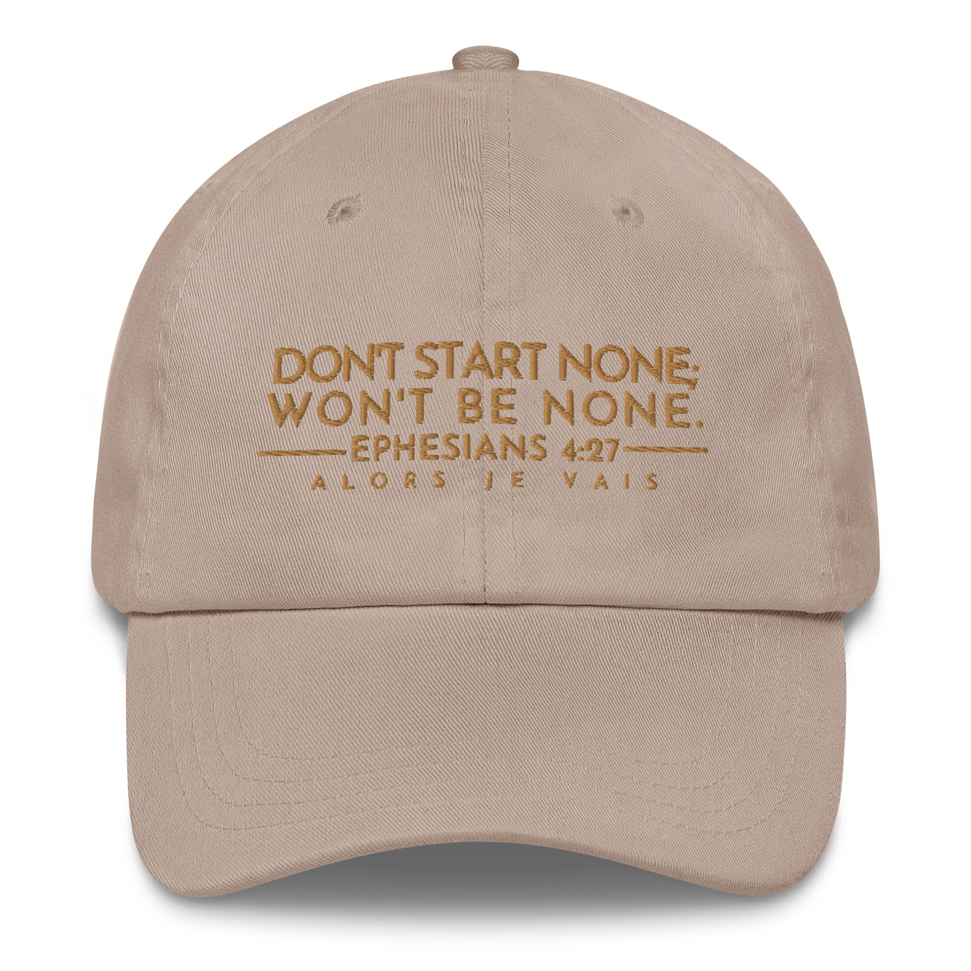 Make a bold statement with the ALORS JE VAIS' DON'T START NONE - WONT BE NONE HAT. Designed for the Christian who exudes confidence and refuses to engage in drama or navigate purposefully into trouble. This hat serves as a reminder to rise above, be authentic, and stay true to your King. Elevate any outfit with this exclusive piece. Made with premium materials and features intricate embroidery.