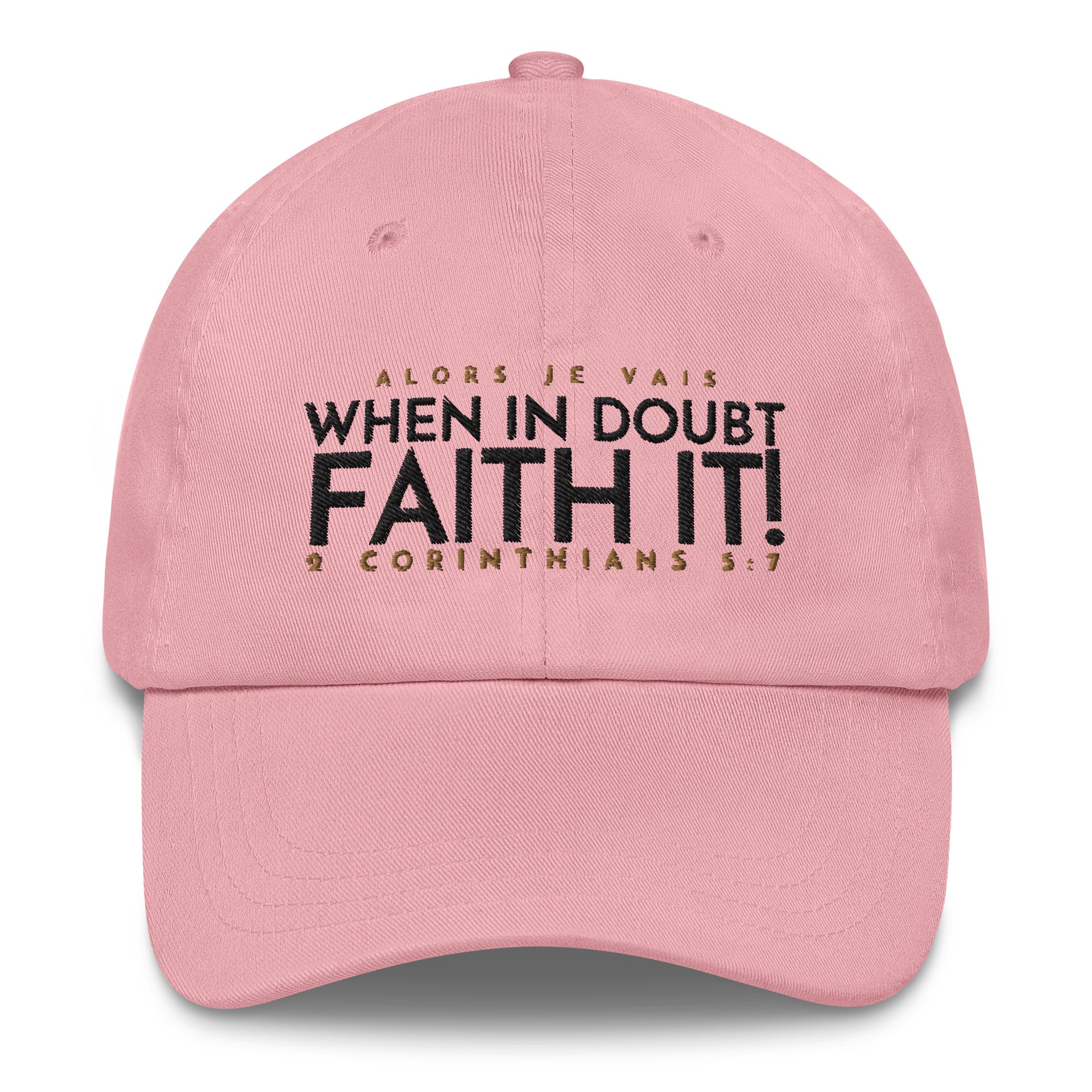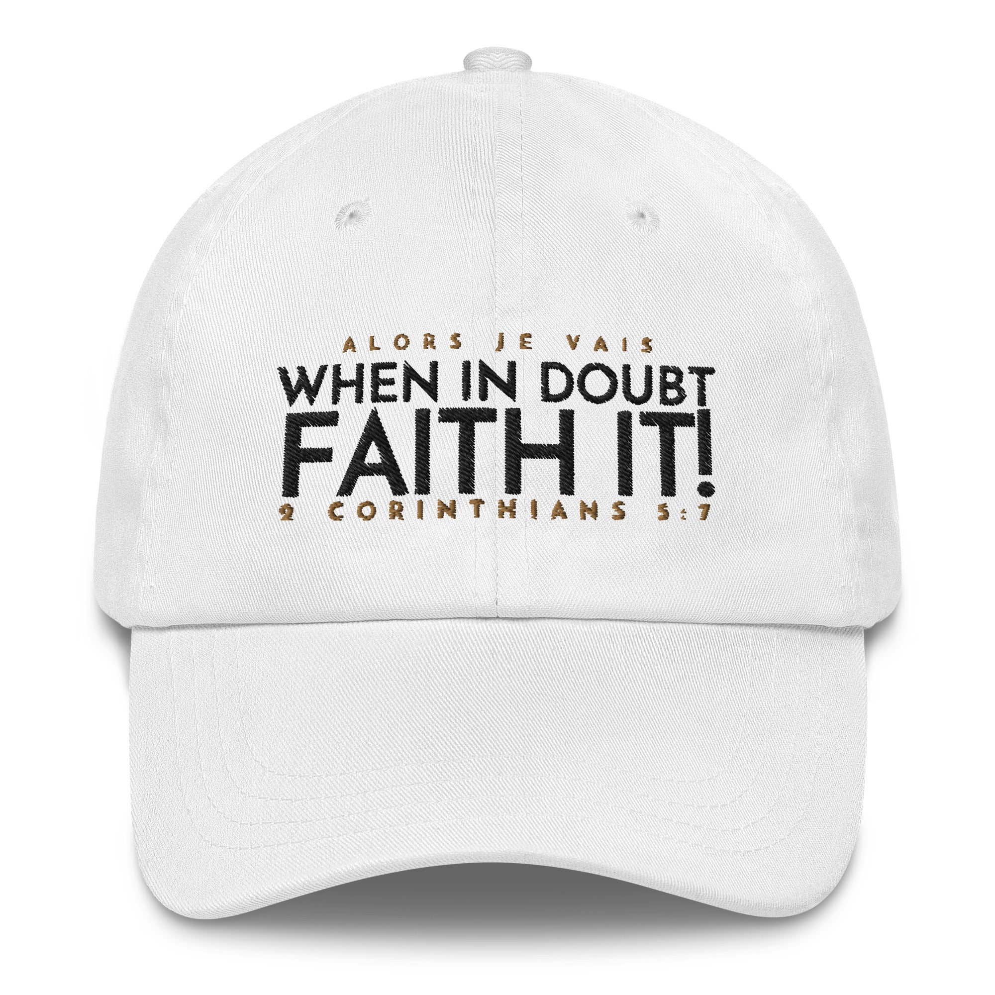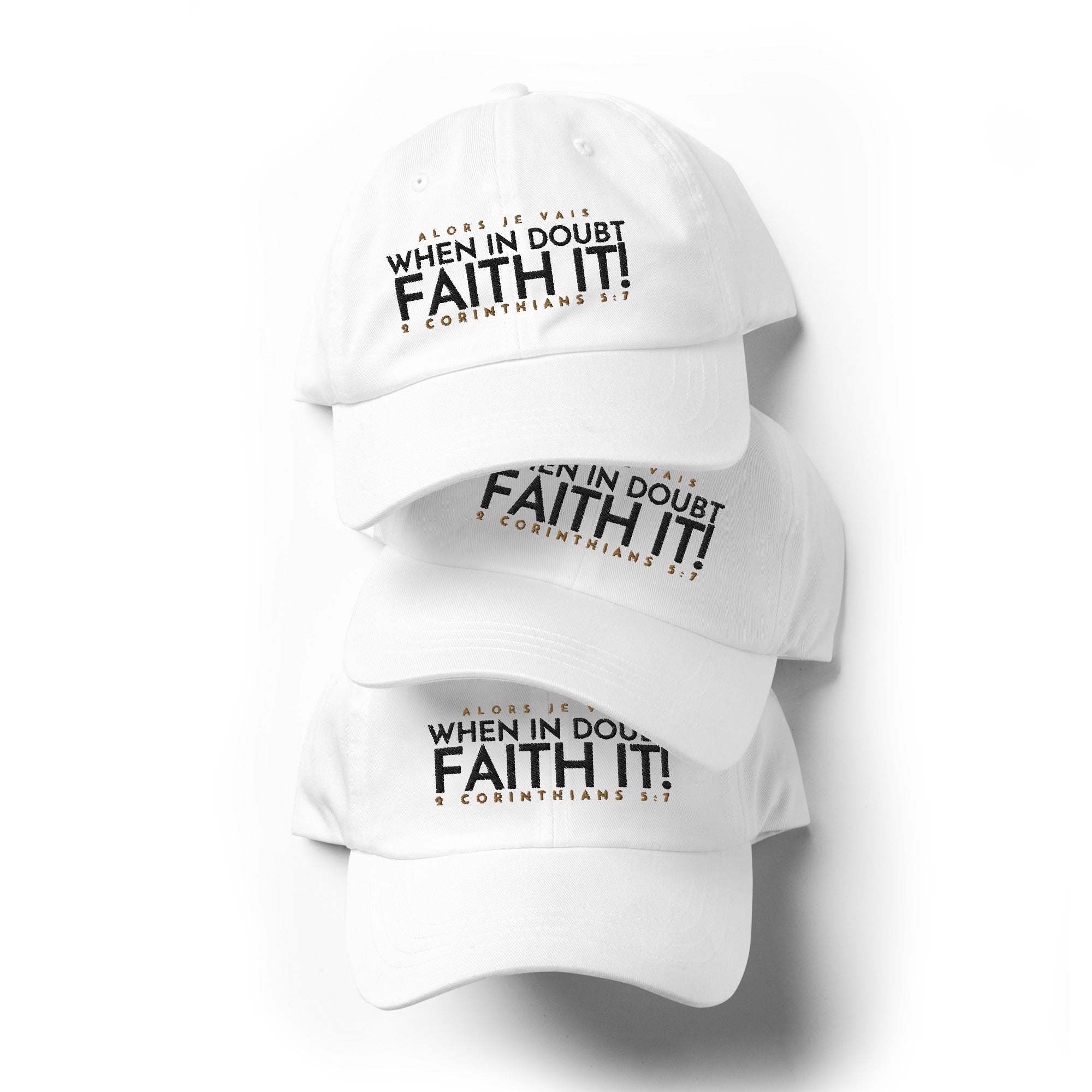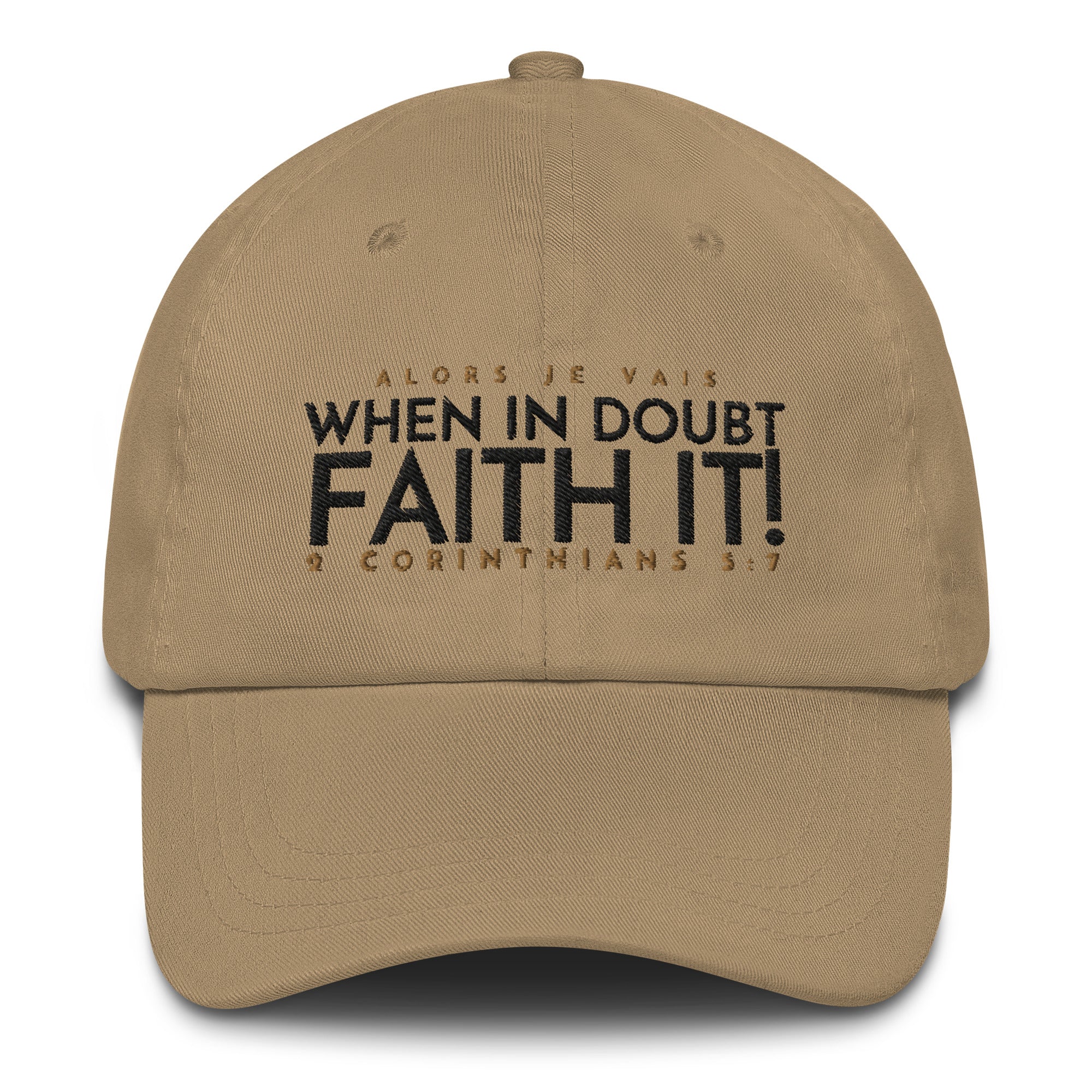 Introducing the ALORS JE VAIS’ FAITH IT DAD HAT - Transform any outfit into a statement piece with the FAITH IT DAD HAT. Embrace your faith and confidence in Christ. Let it serve as a symbol of your unwavering faith. You'll feel confident and stylish while sporting this subtle yet powerful statement piece. Embrace the power of faith and style with your FAITH IT dad hat.