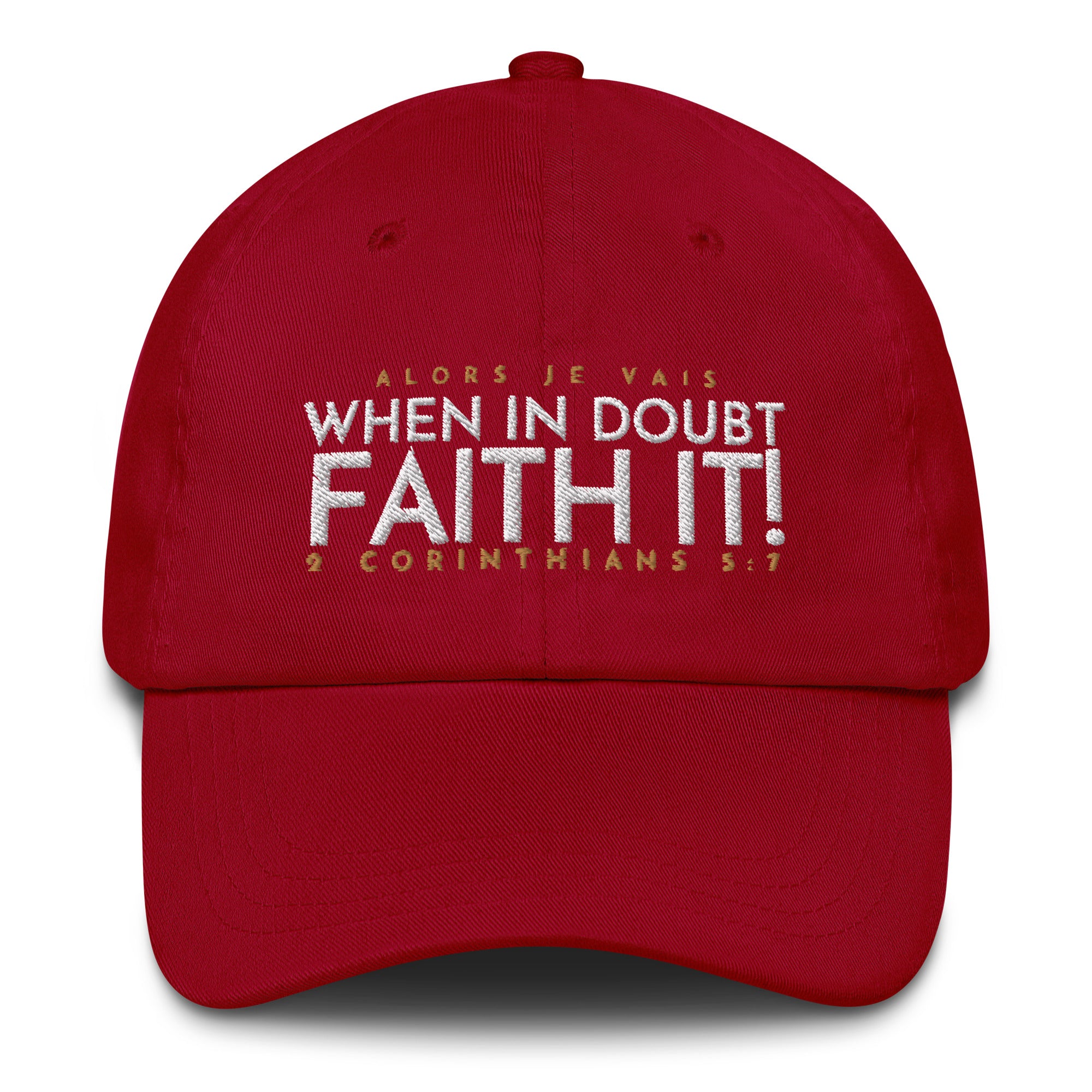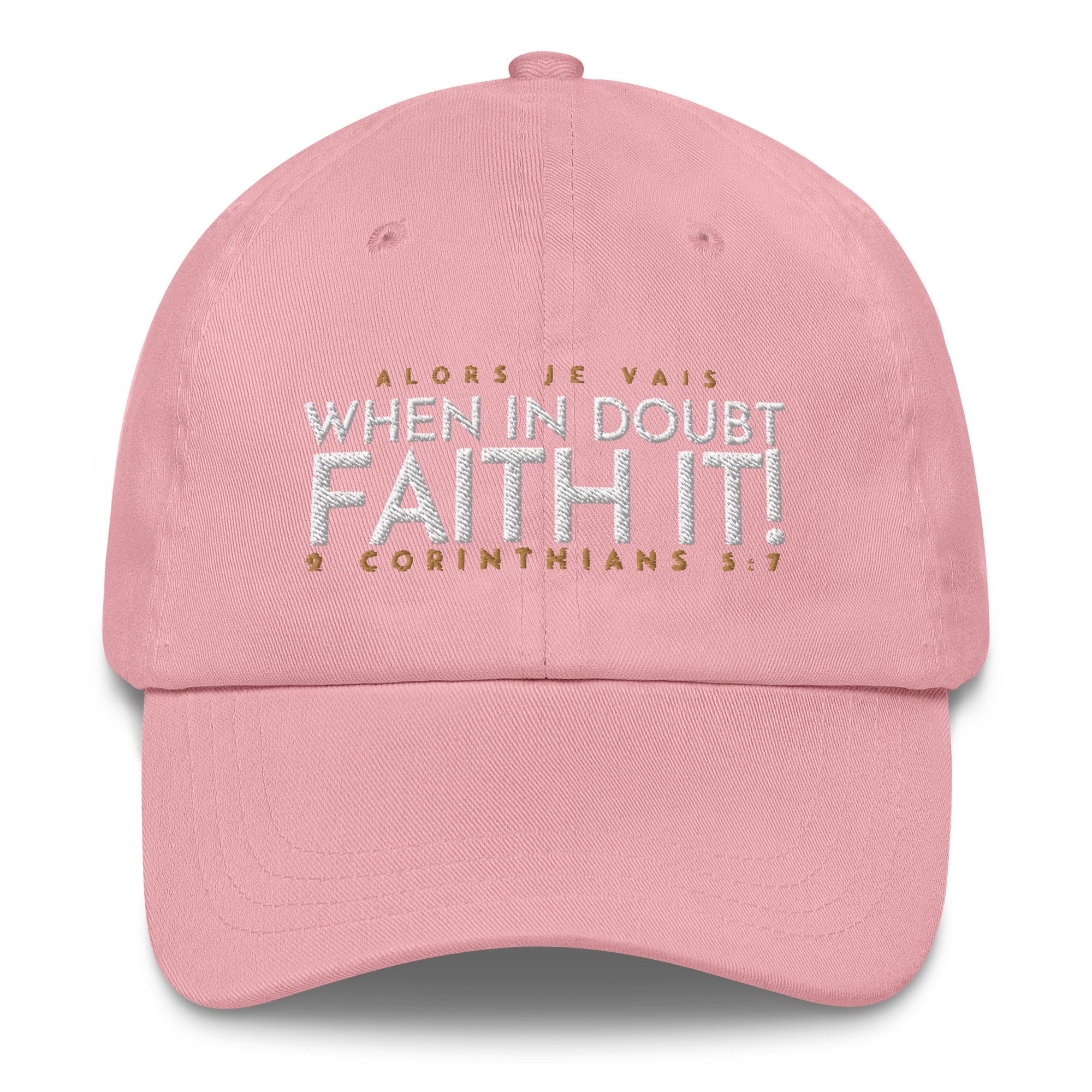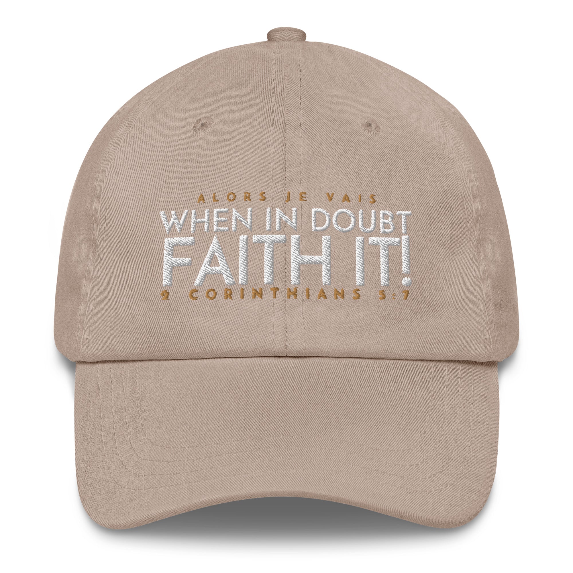 Introducing the ALORS JE VAIS’ FAITH IT DAD HAT - Transform any outfit into a statement piece with the FAITH IT DAD HAT. Embrace your faith and confidence in Christ. Let it serve as a symbol of your unwavering faith. You'll feel confident and stylish while sporting this subtle yet powerful statement piece. Embrace the power of faith and style with your FAITH IT dad hat.