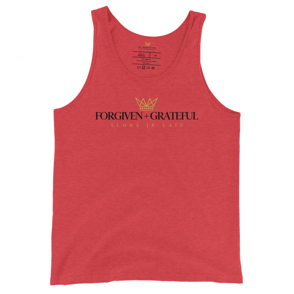 Show your gratitude and forgiveness without saying a word with your ALORS JE VAIS CLASSIC FORGIVEN + GRATEFUL UNISEX TANK.