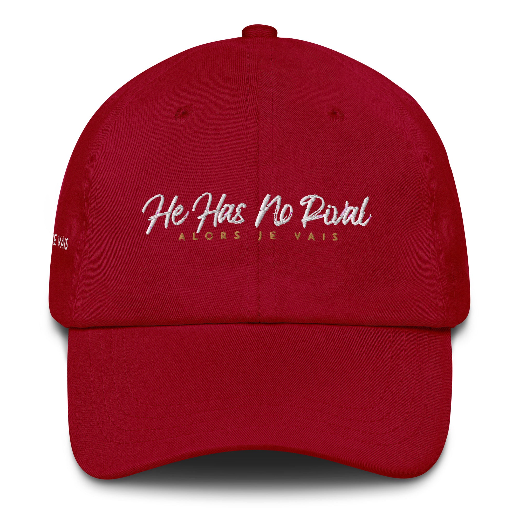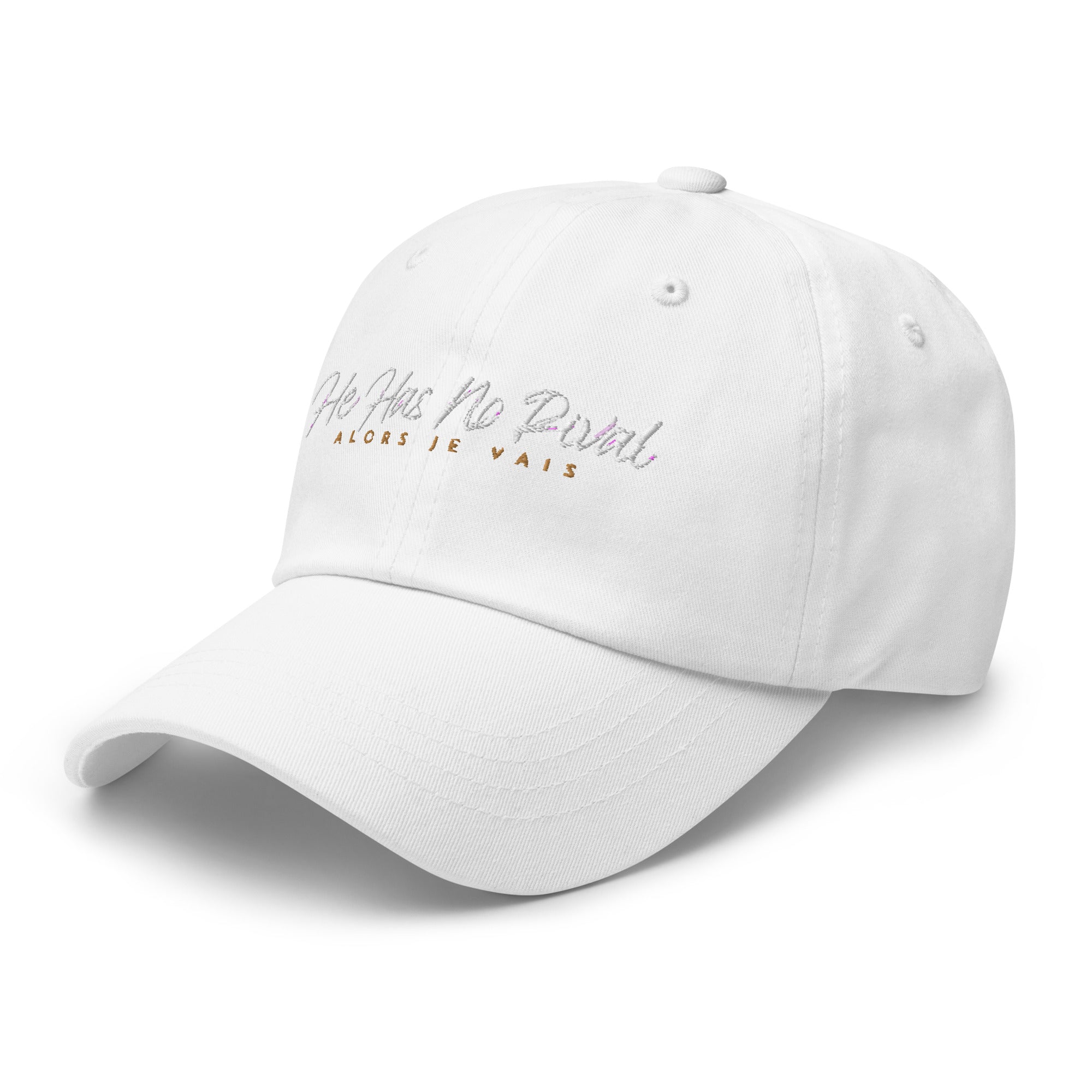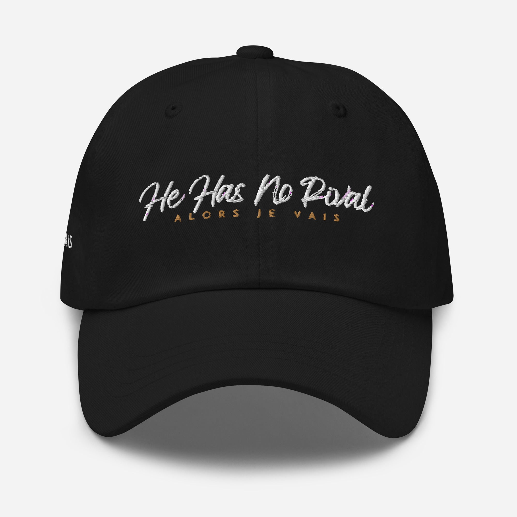 ALORS JE VAIS’ HE HAS NO RIVAL - Unleash your inner confidence with this premium HE has NO rival Dad hat. Its striking design and high-quality craftsmanship make it a statement piece fit for the most discerning fashion connoisseurs. Don't compromise on style, elevate your wardrobe with this exclusive hat.