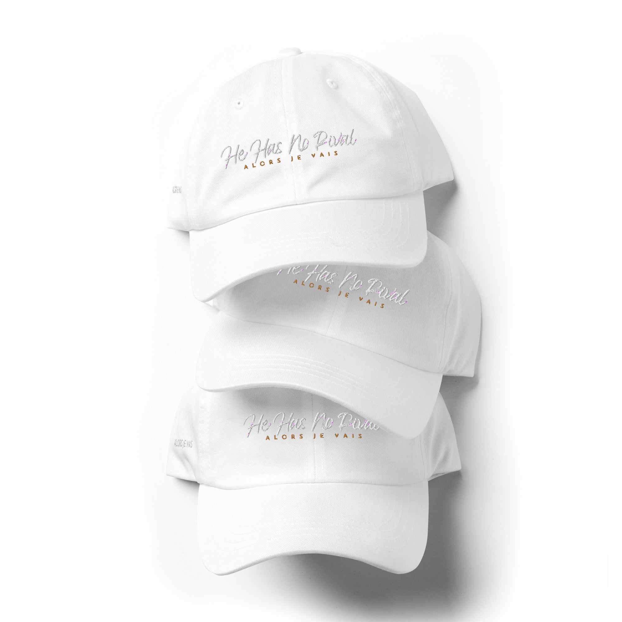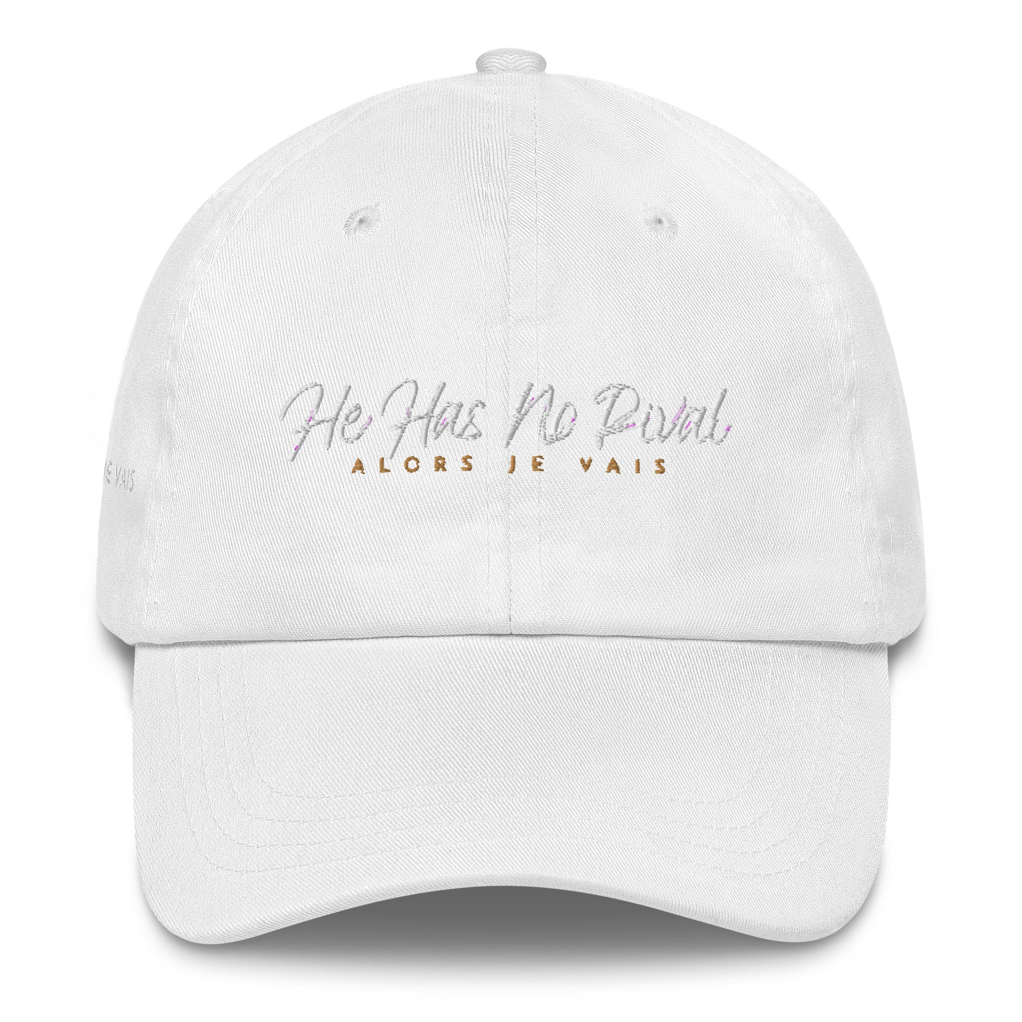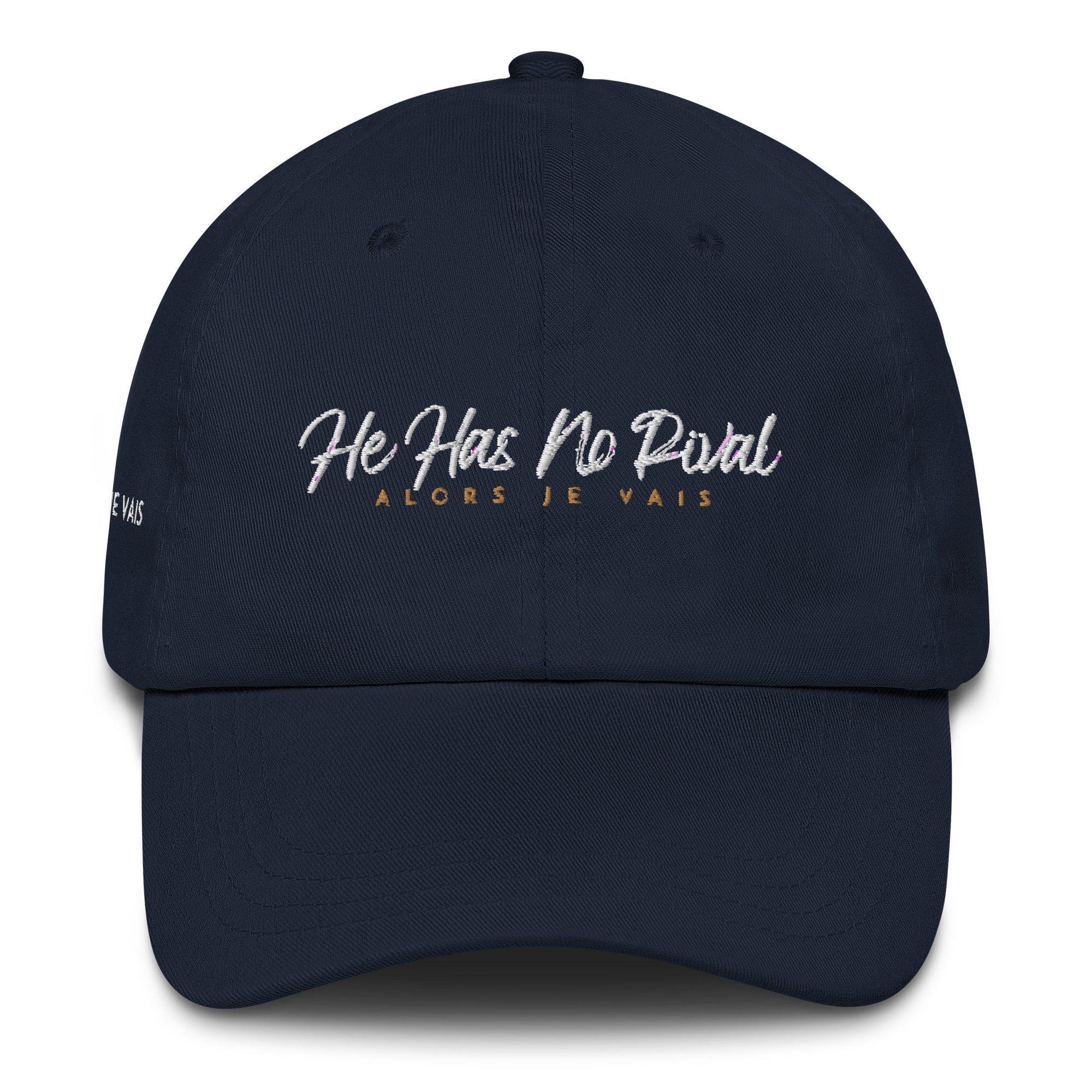 ALORS JE VAIS’ HE HAS NO RIVAL - Unleash your inner confidence with this premium HE has NO rival Dad hat. Its striking design and high-quality craftsmanship make it a statement piece fit for the most discerning fashion connoisseurs. Don't compromise on style, elevate your wardrobe with this exclusive hat.