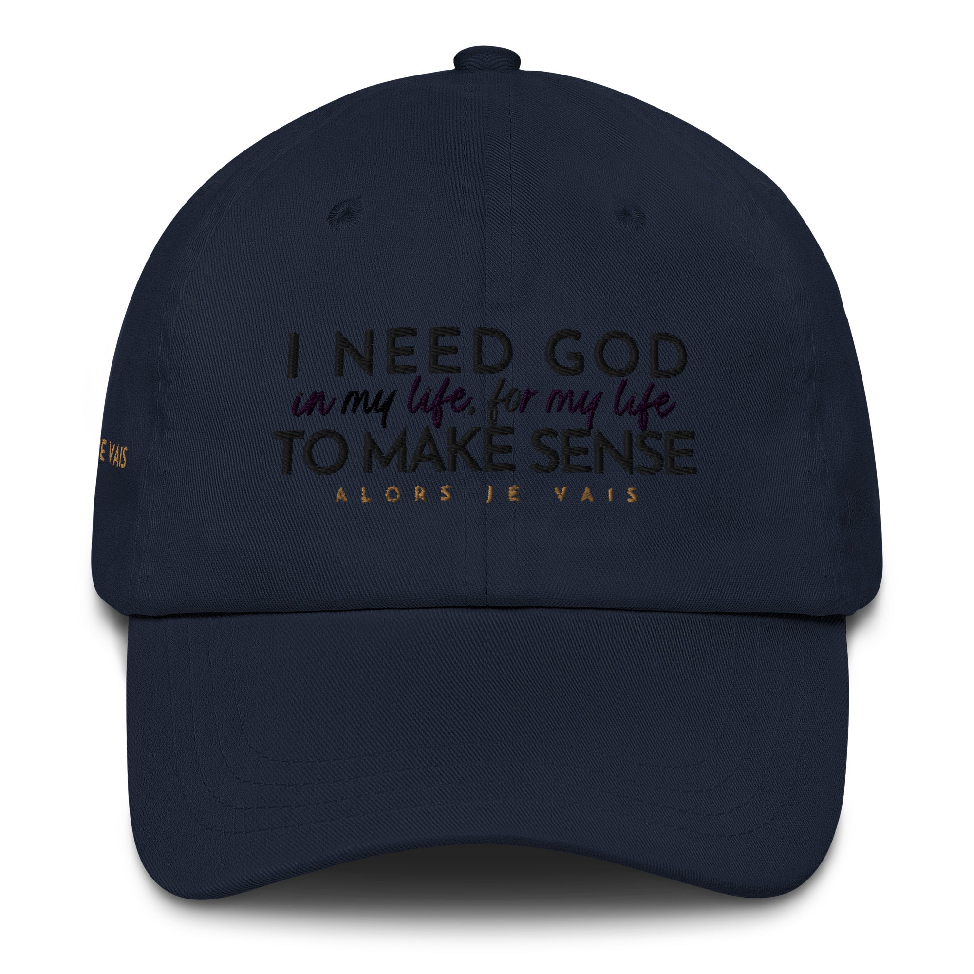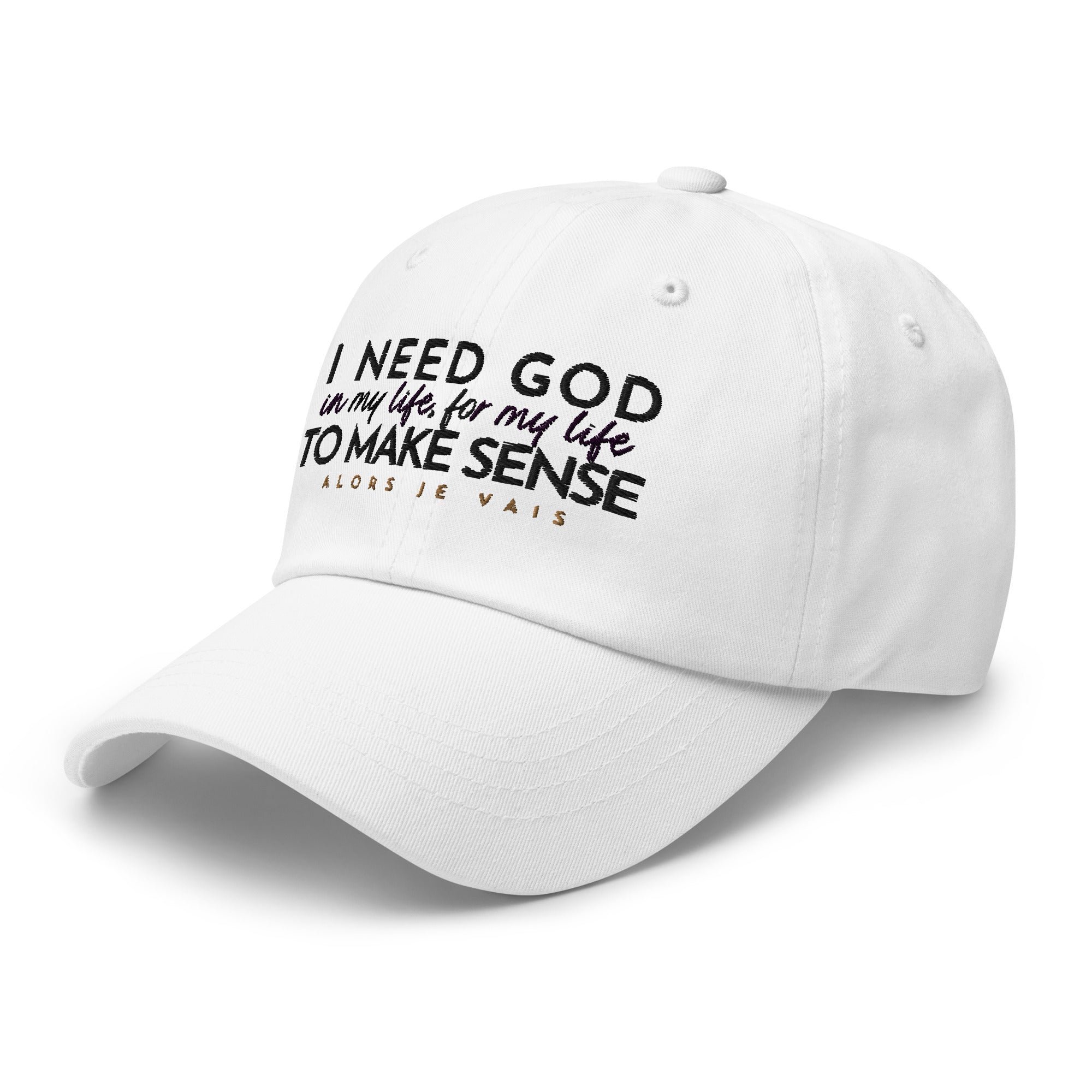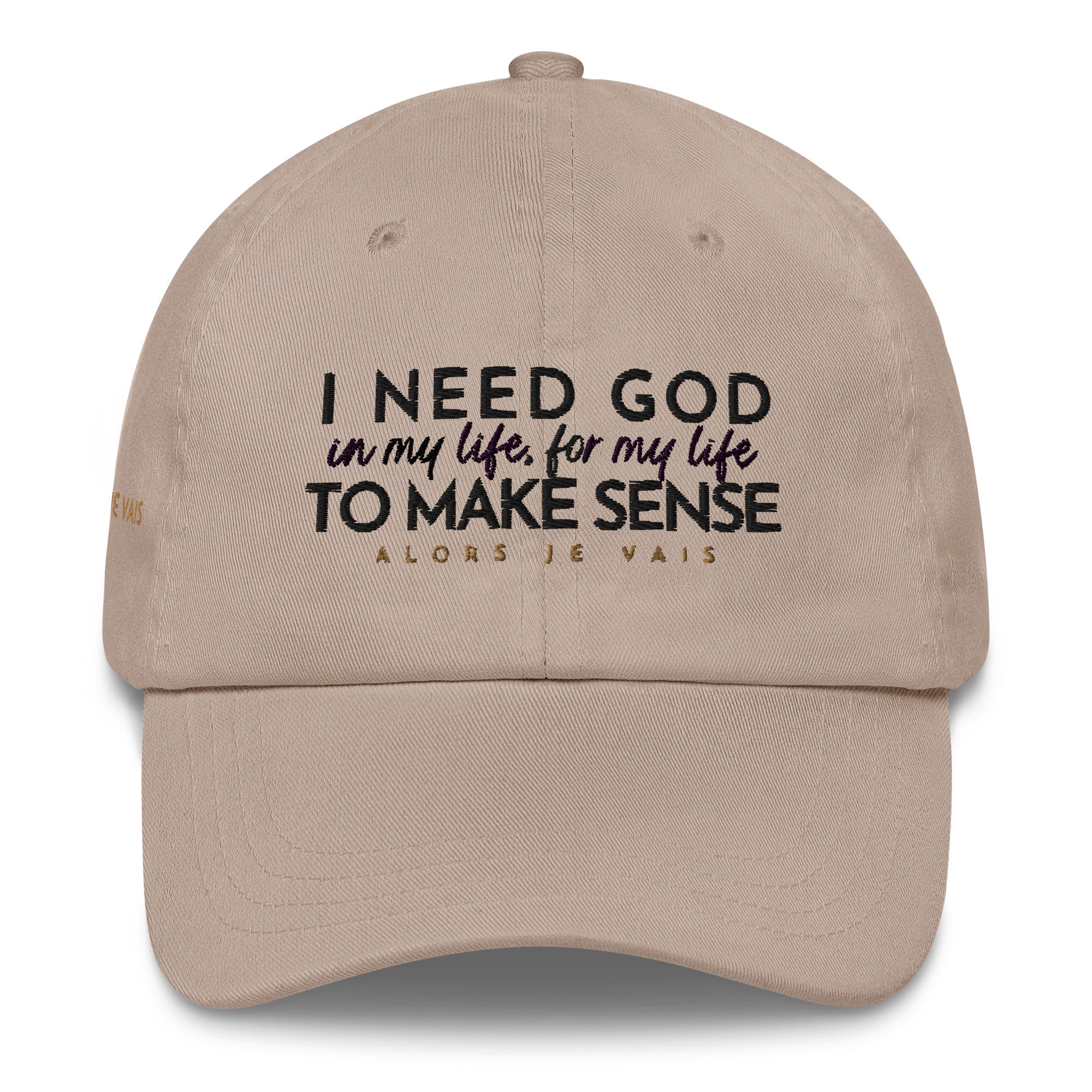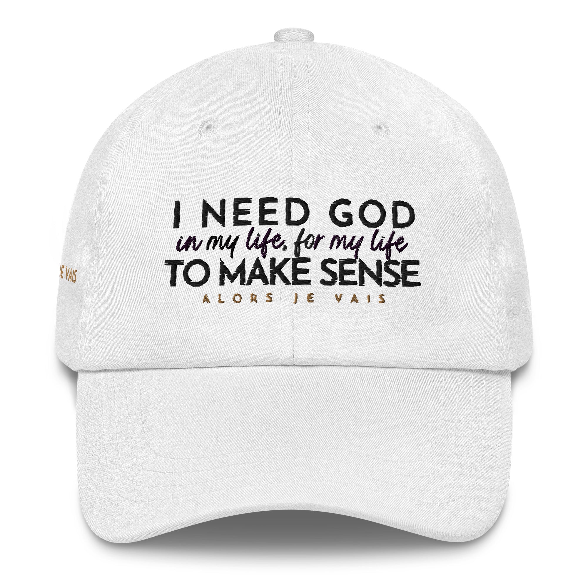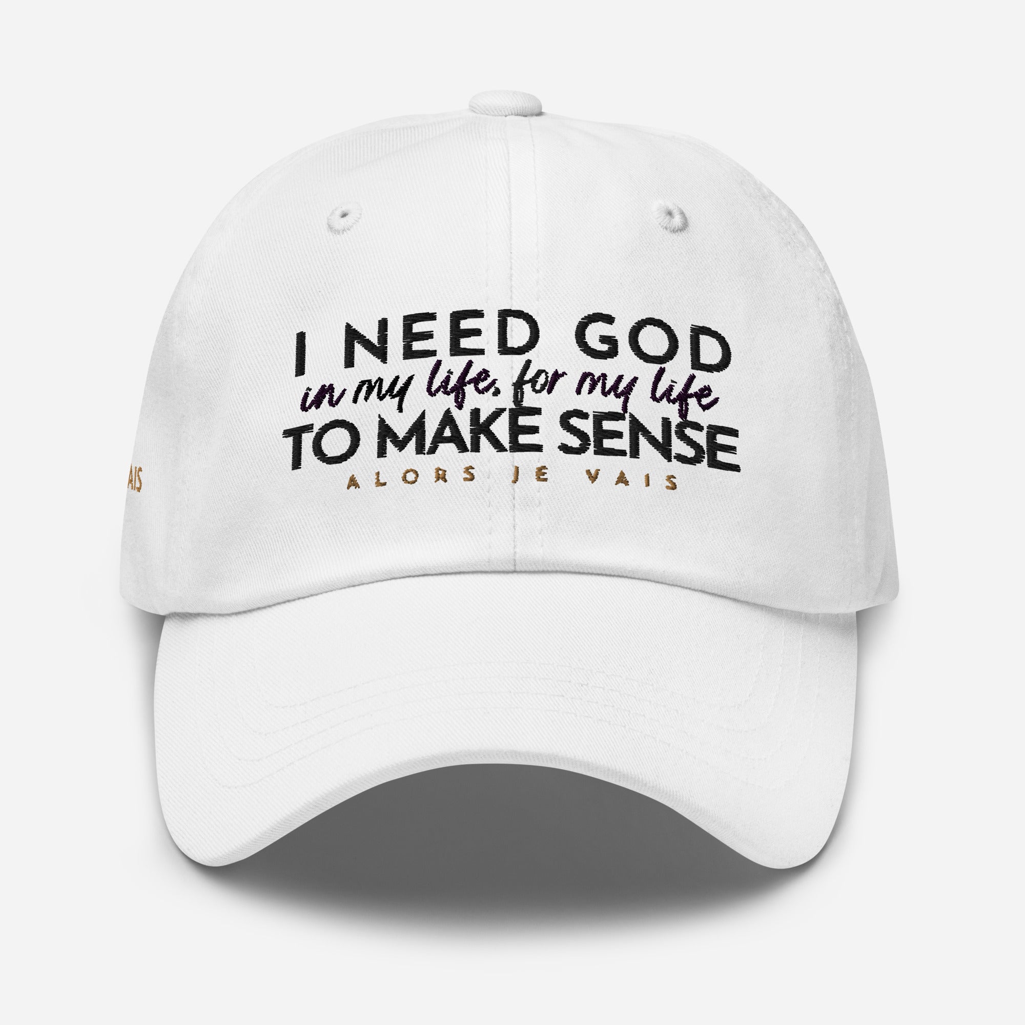 ALORS JE VAIS' I NEED GOD HAT Embraces and acknowledges The Lord’s divine protection that gives you deep inner strength in Him!!  Its subtle yet powerful message makes a statement of faith and confidence, while its sleek and classic design adds a touch of sophistication to any outfit. Made with high-quality materials and expert craftsmanship, this hat is not only a fashion statement, but an investment in both style and spiritual well-being. Elevate your wardrobe and your spirit with your I NEED GOD dad hat.