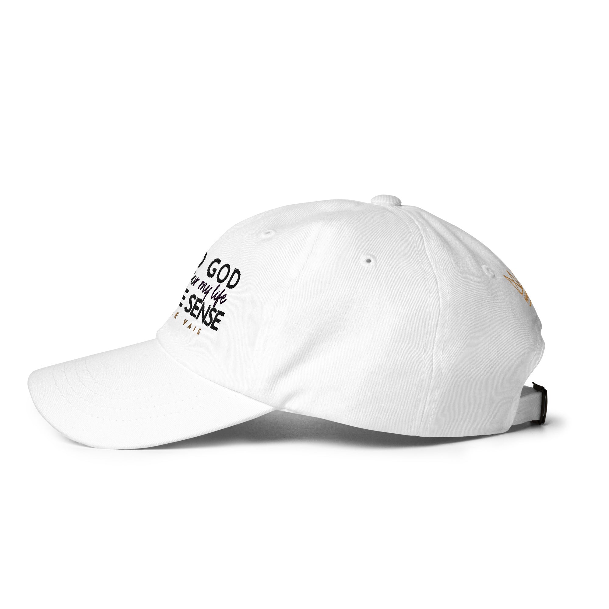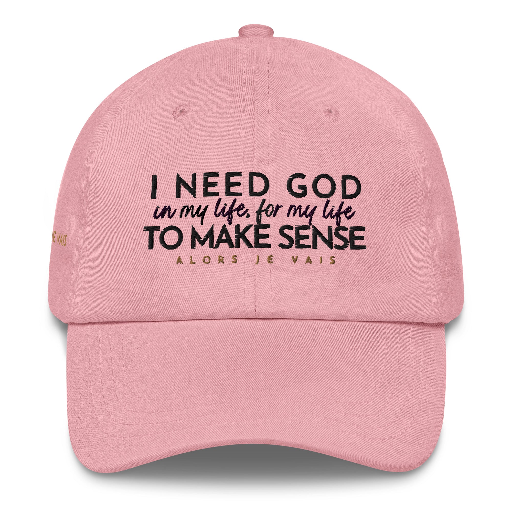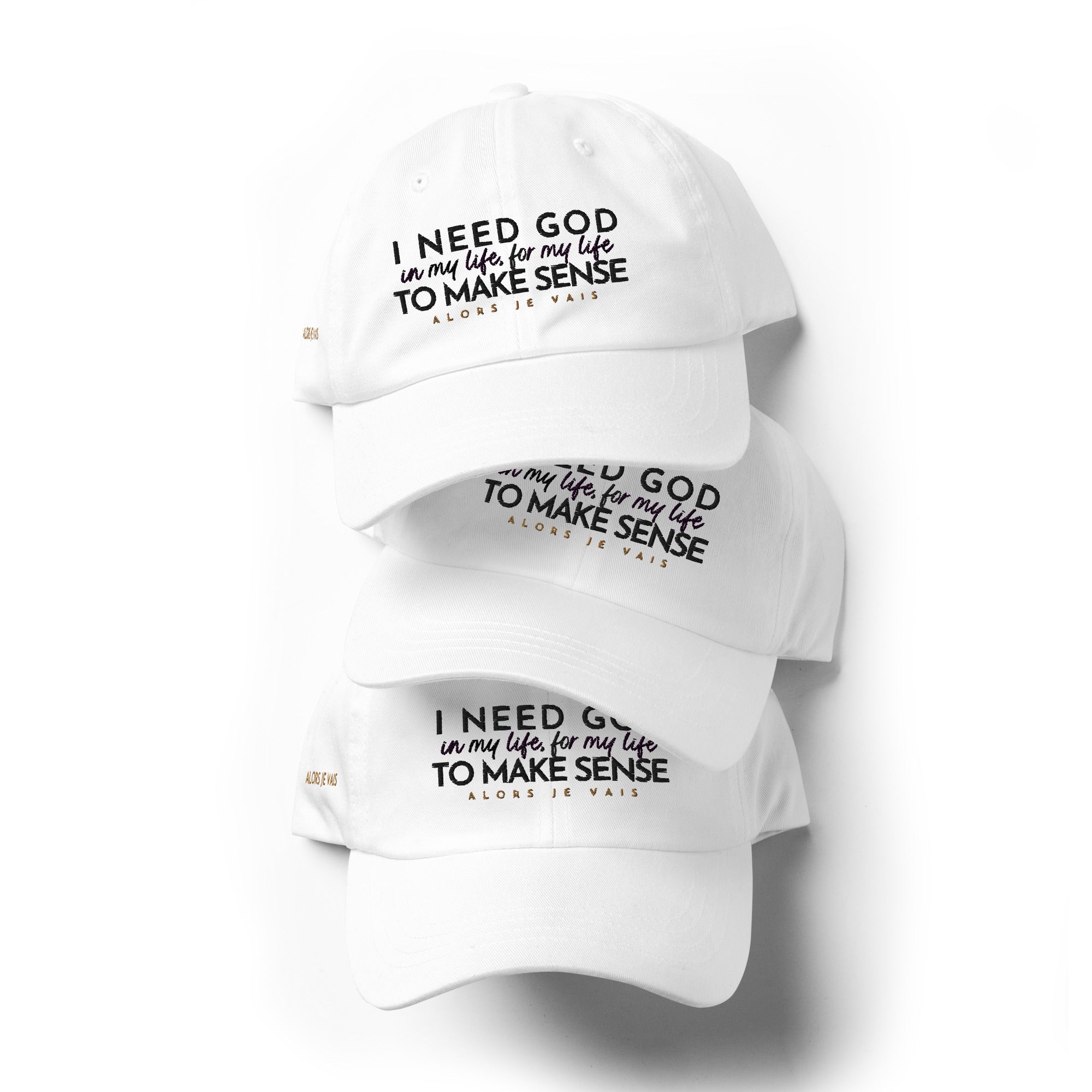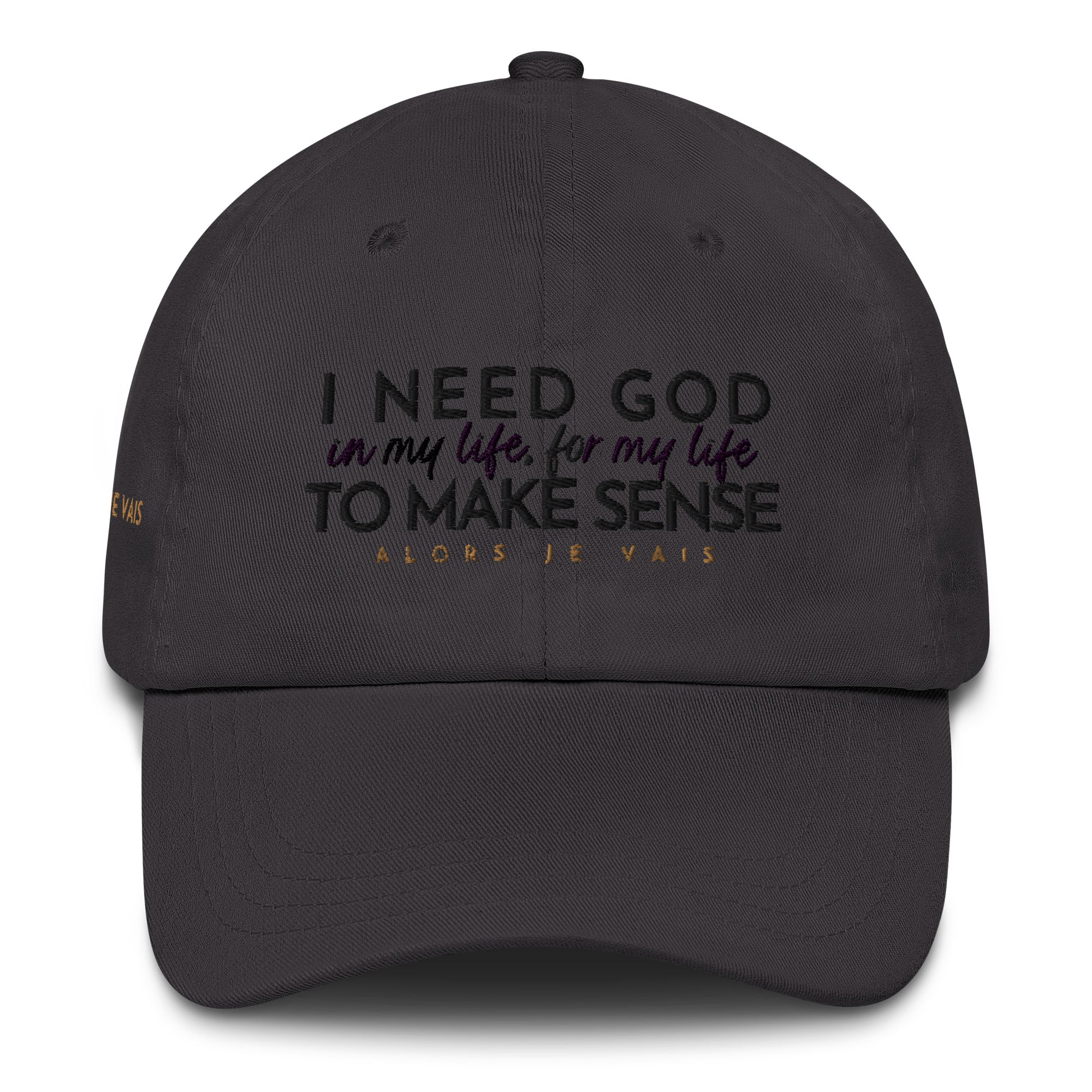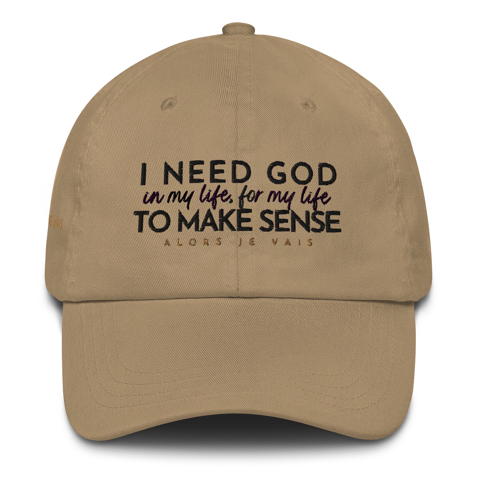 ALORS JE VAIS' I NEED GOD HAT Embraces and acknowledges The Lord’s divine protection that gives you deep inner strength in Him!!  Its subtle yet powerful message makes a statement of faith and confidence, while its sleek and classic design adds a touch of sophistication to any outfit. Made with high-quality materials and expert craftsmanship, this hat is not only a fashion statement, but an investment in both style and spiritual well-being. Elevate your wardrobe and your spirit with your I NEED GOD dad hat.