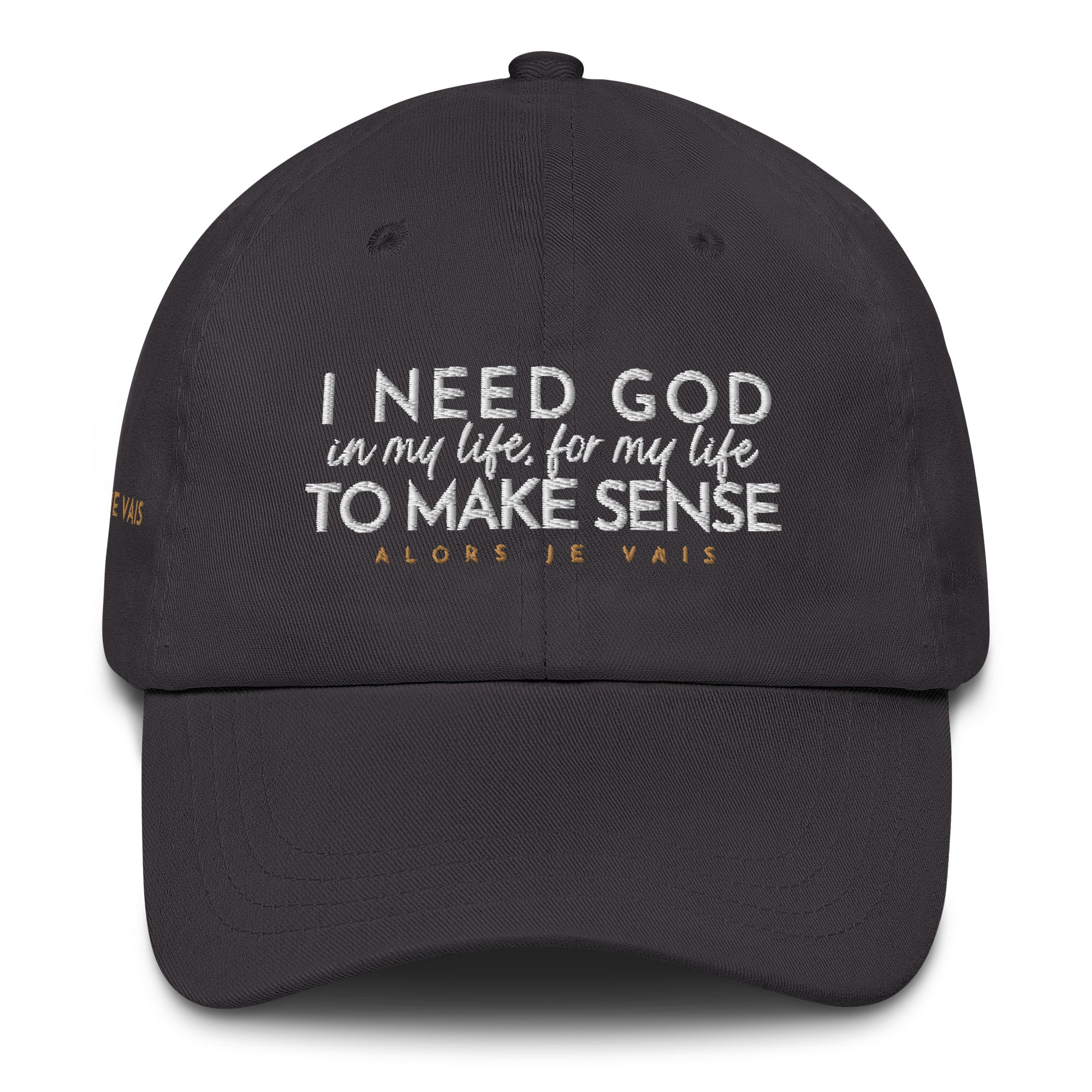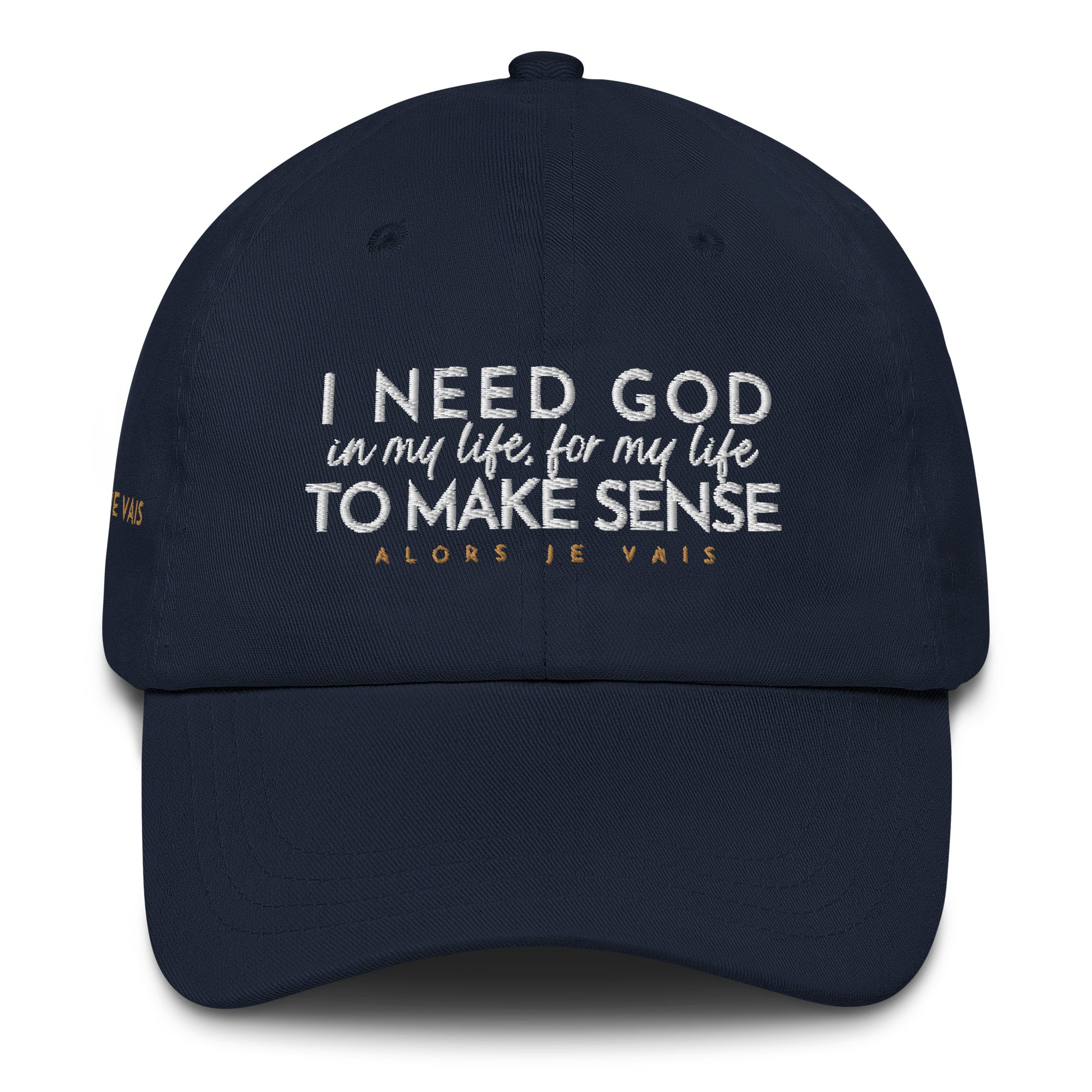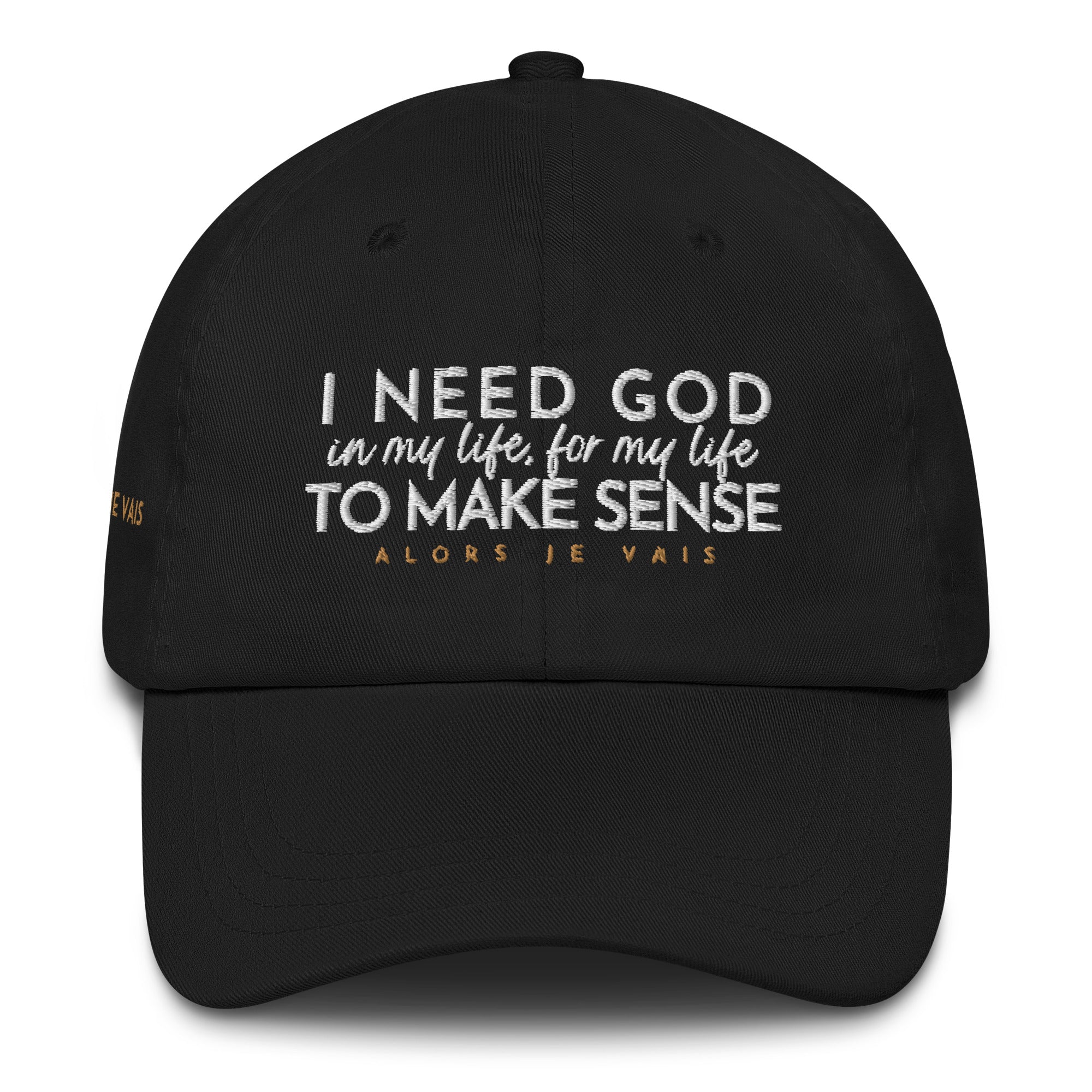 Alors je vais’ I NEED GOD HAT Embraces and acknowledges The Lord’s divine protection that gives you deep inner strength in Him!! Its subtle yet powerful message makes a statement of faith and confidence, while its sleek and classic design adds a touch of sophistication to any outfit. Made with high-quality materials and expert craftsmanship, this hat is not only a fashion statement, but an investment in both style and spiritual well-being. Elevate your wardrobe and your spirit with your I NEED GOD dad hat.