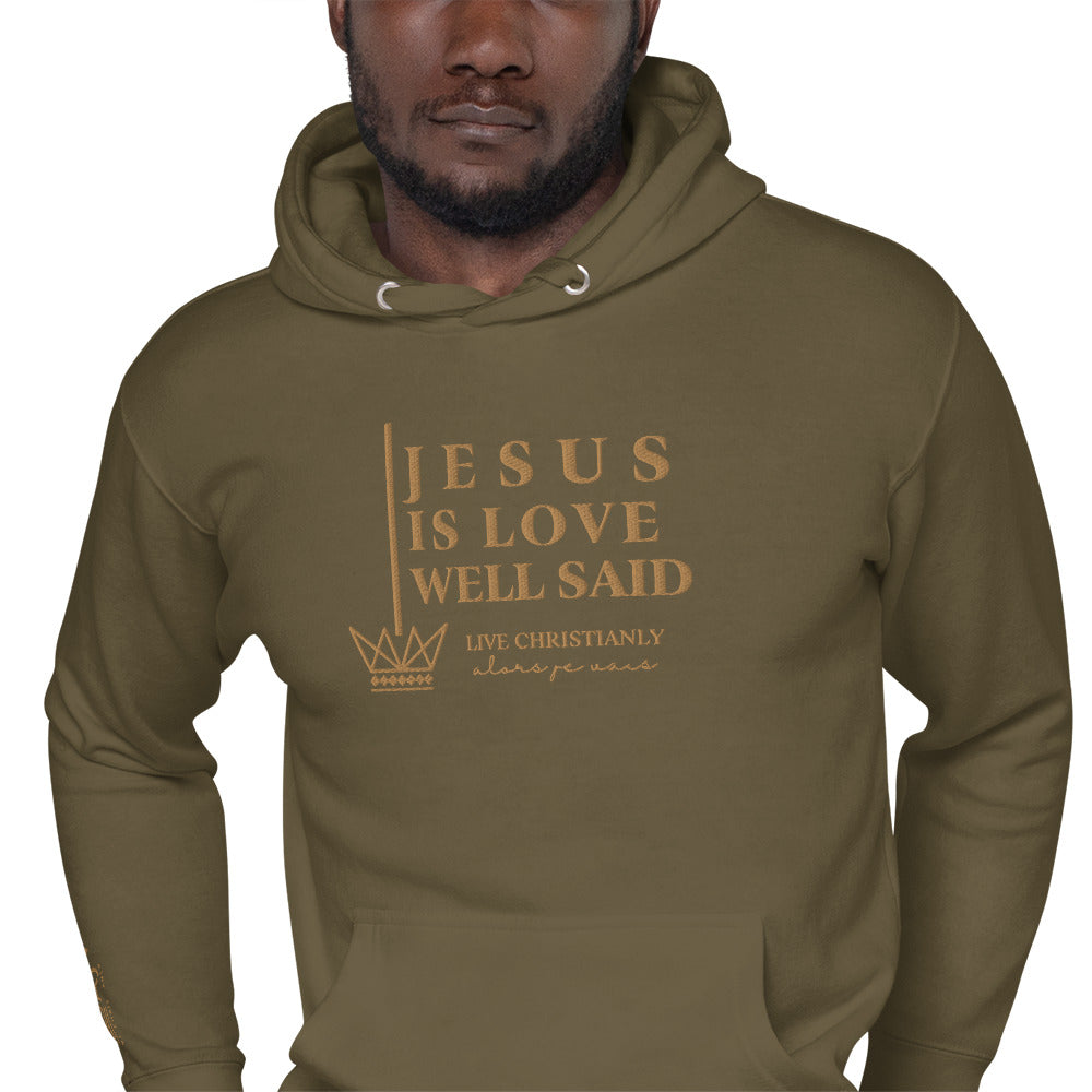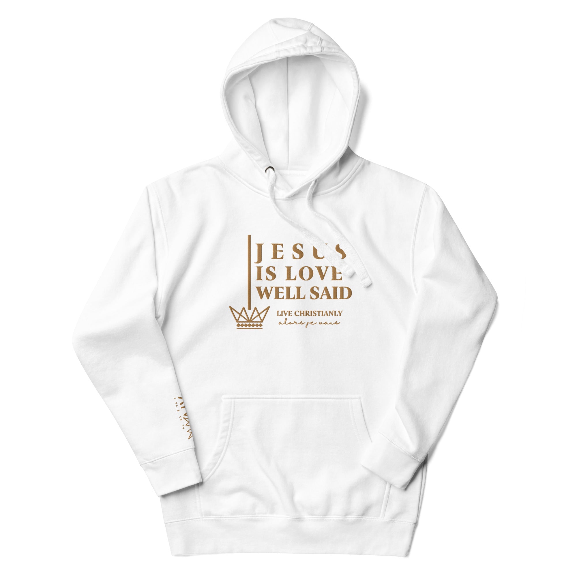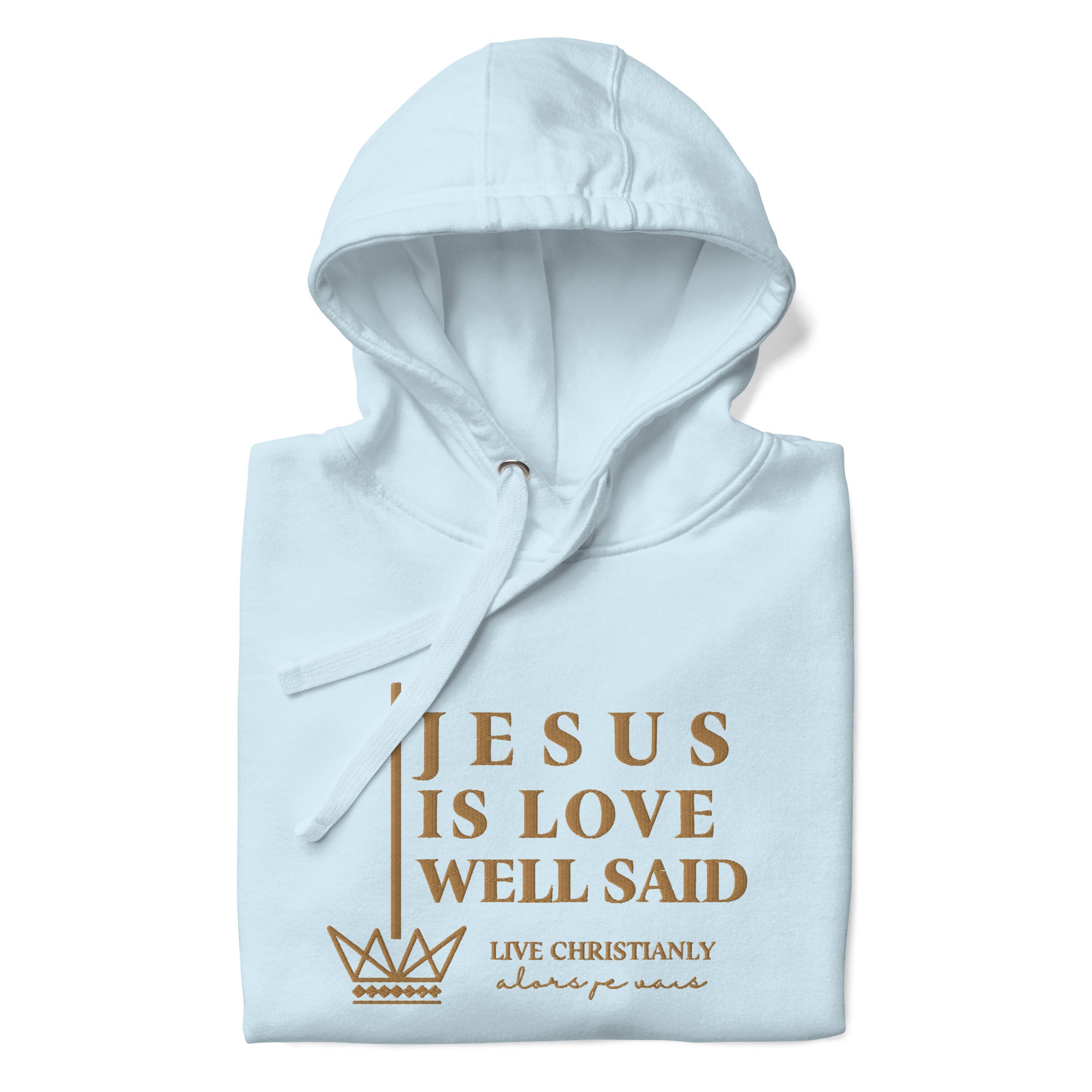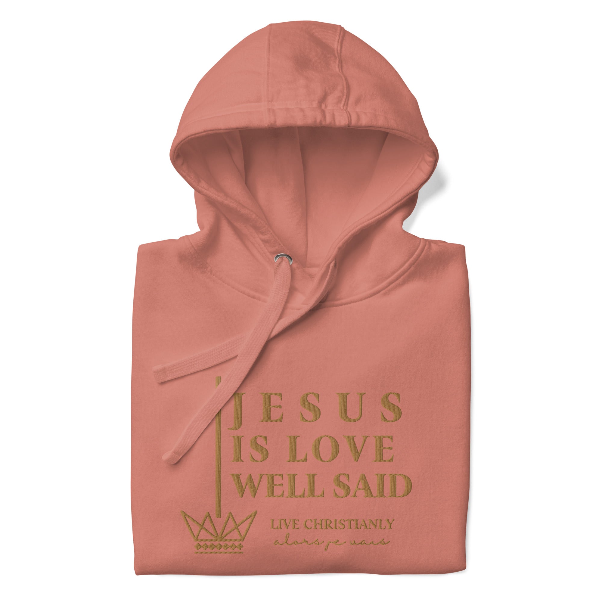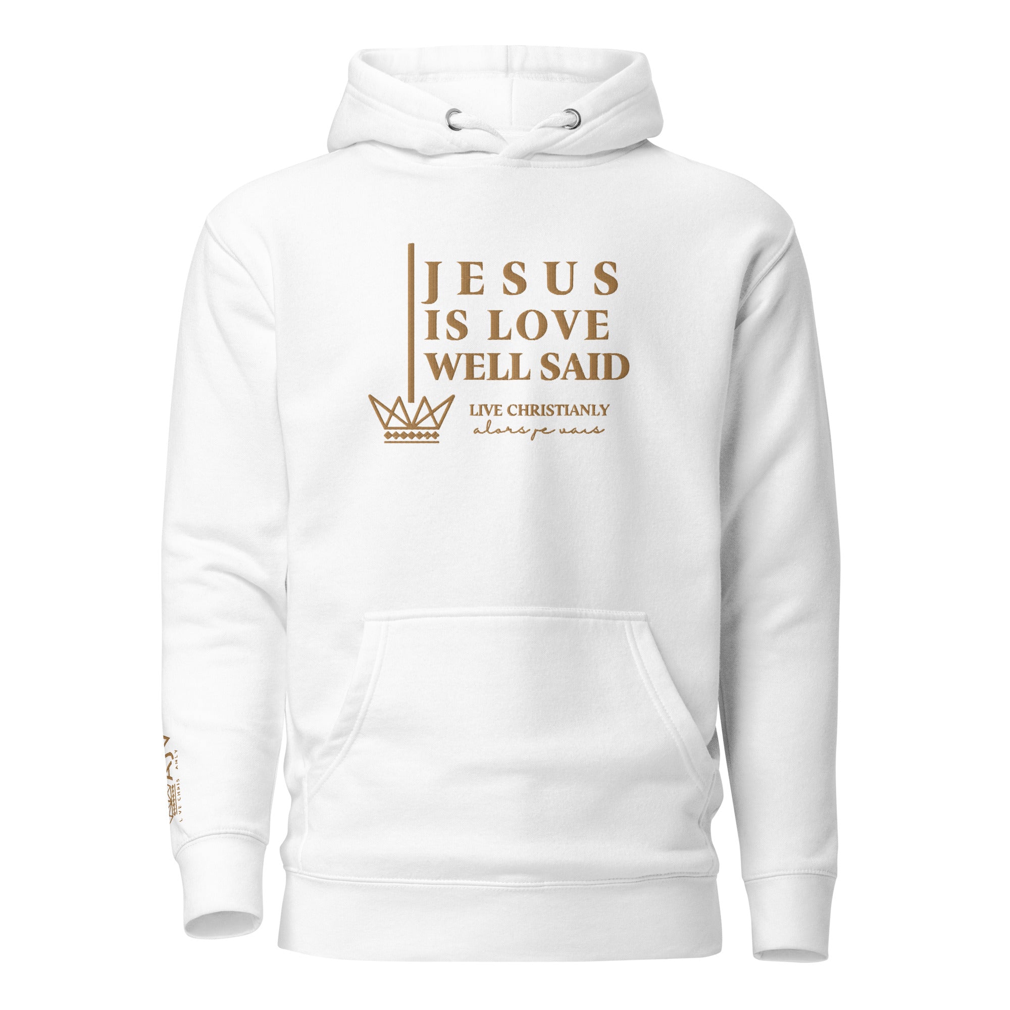 The luxurious way to show off your faith. Wrap yourself in the ultimate comfort and style with our 'JESUS IS LOVE WELL SAID Hoodie'. Perfect for any occasion, this hoodie serves as a reminder of your devotion while elevating your wardrobe. Crafted with the highest quality materials, it's a must-have for any fashion-forward believer; a product loved by those with discerning taste.in the warmth of love and tranquility that only comes from loving Jesus.