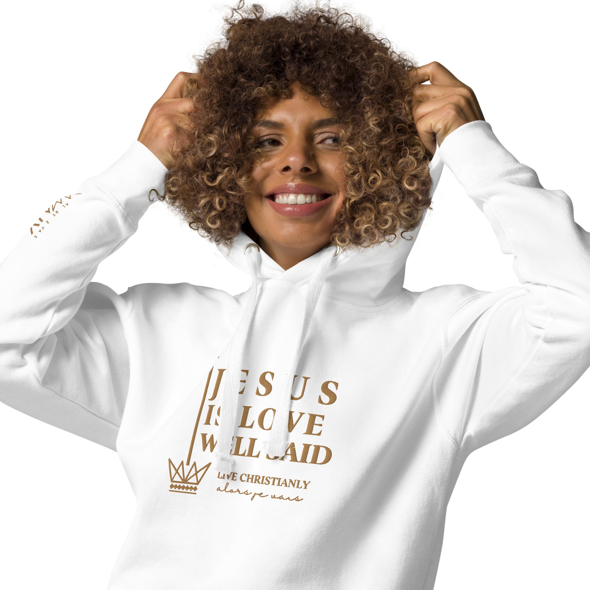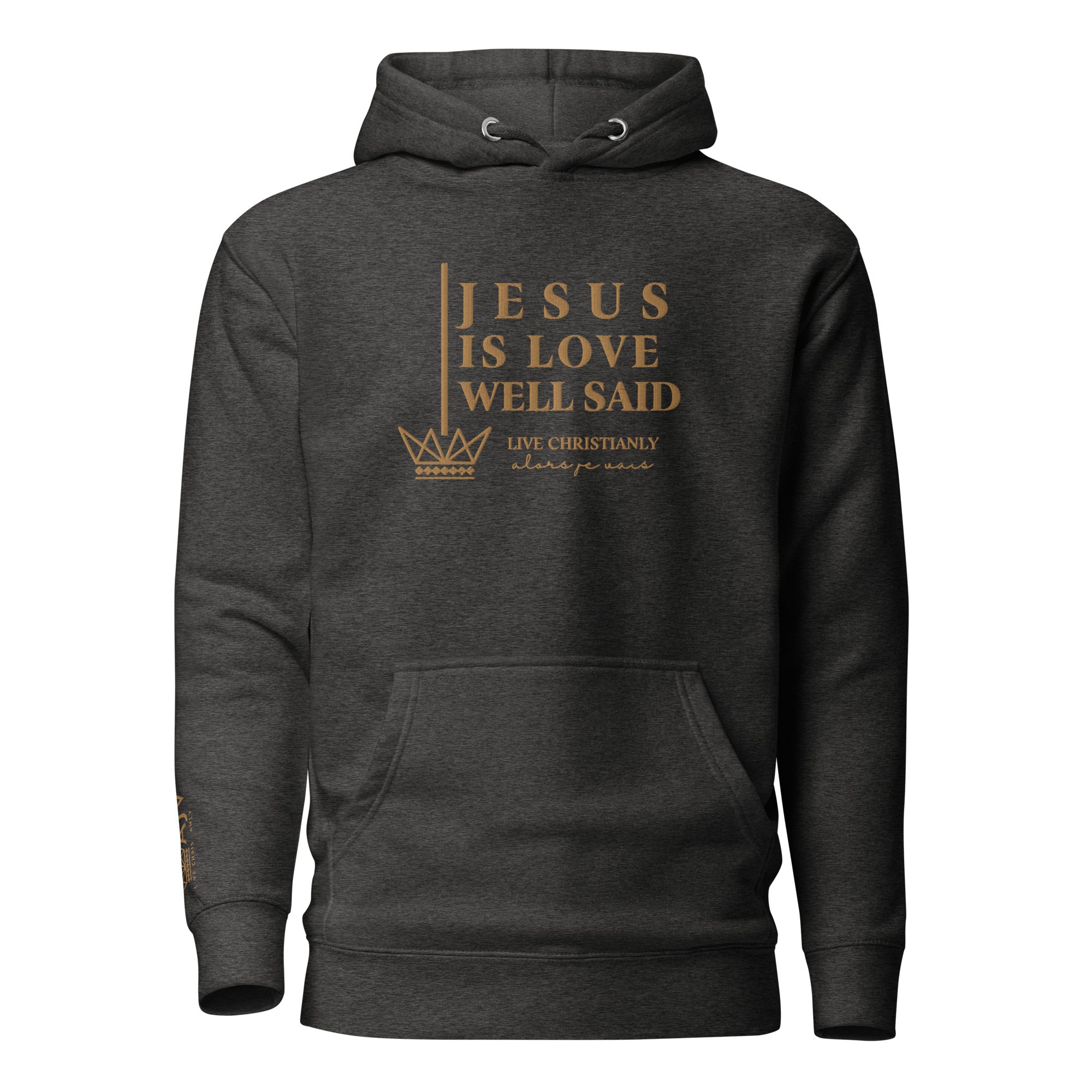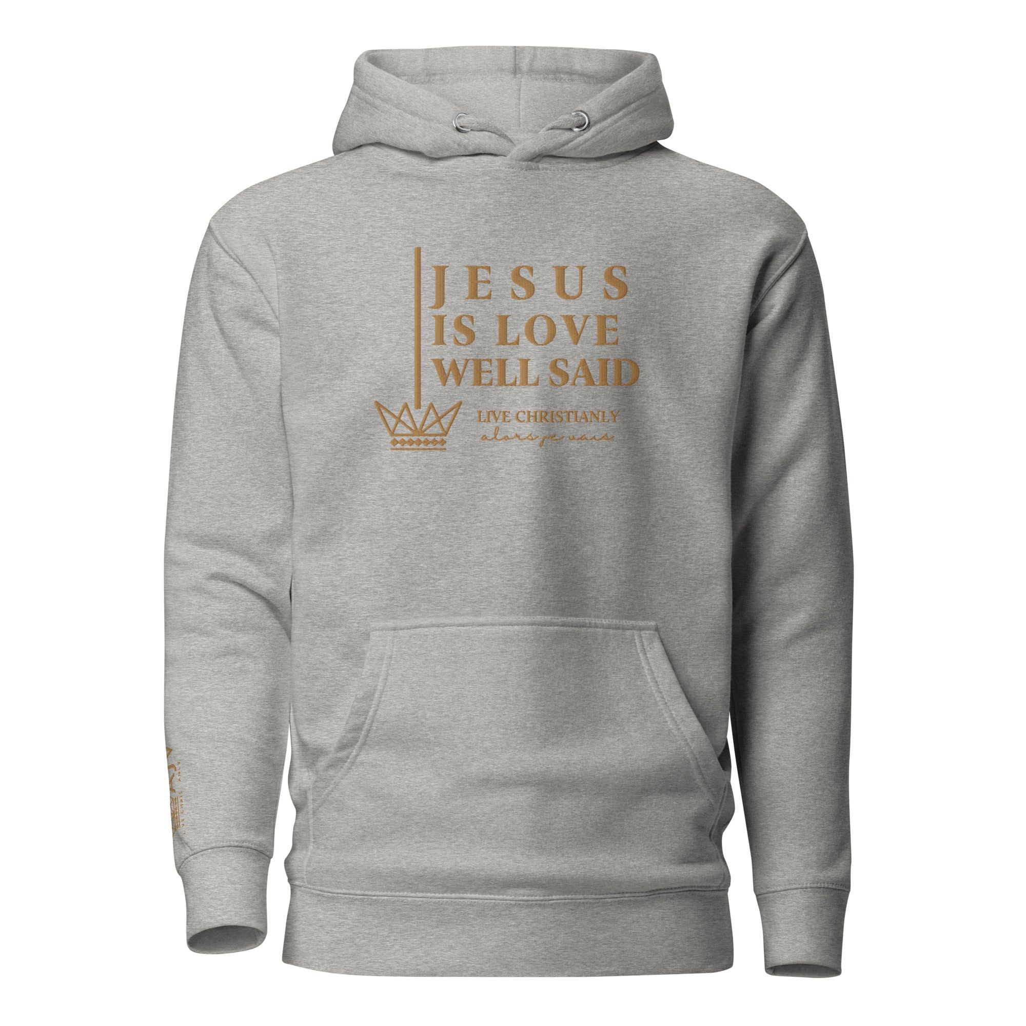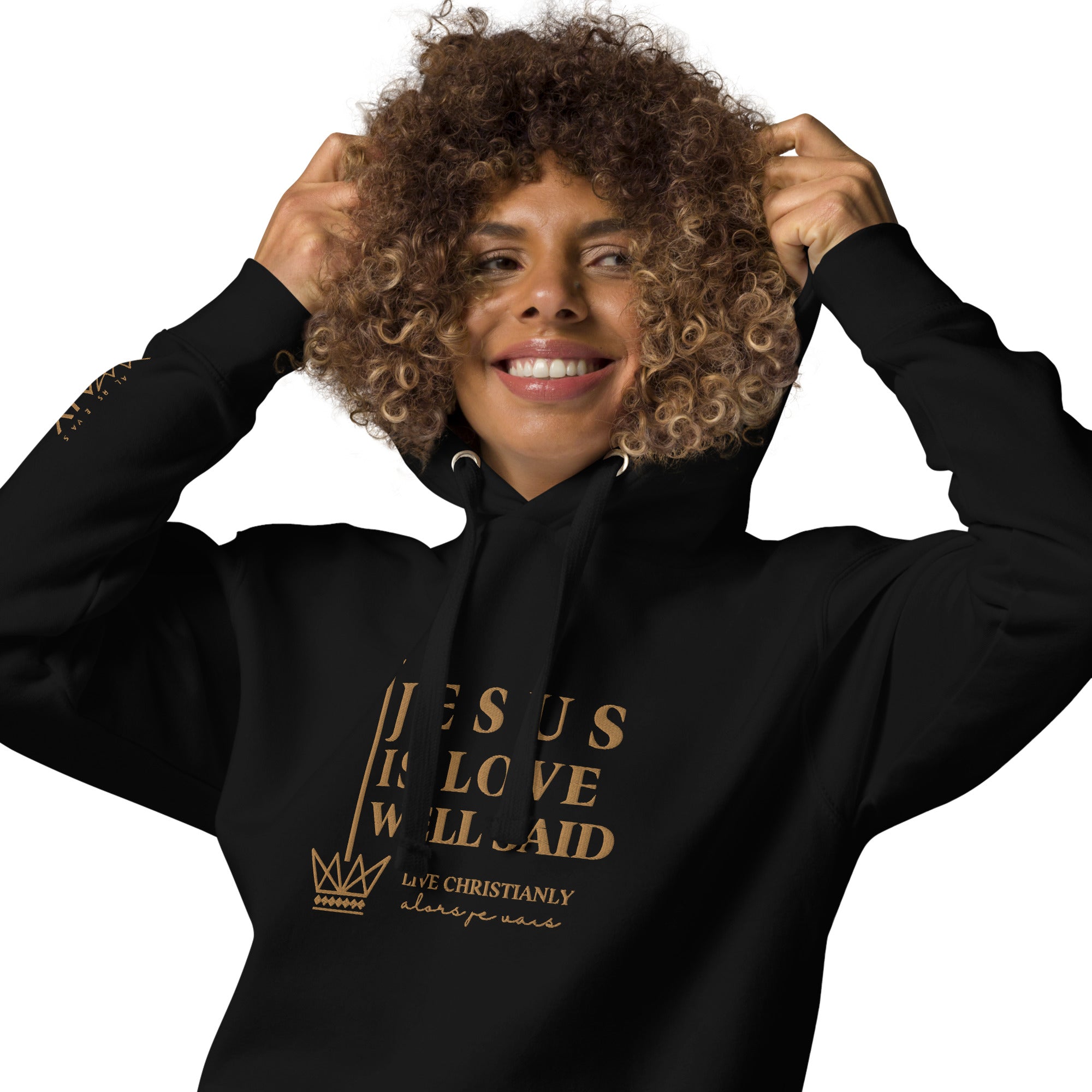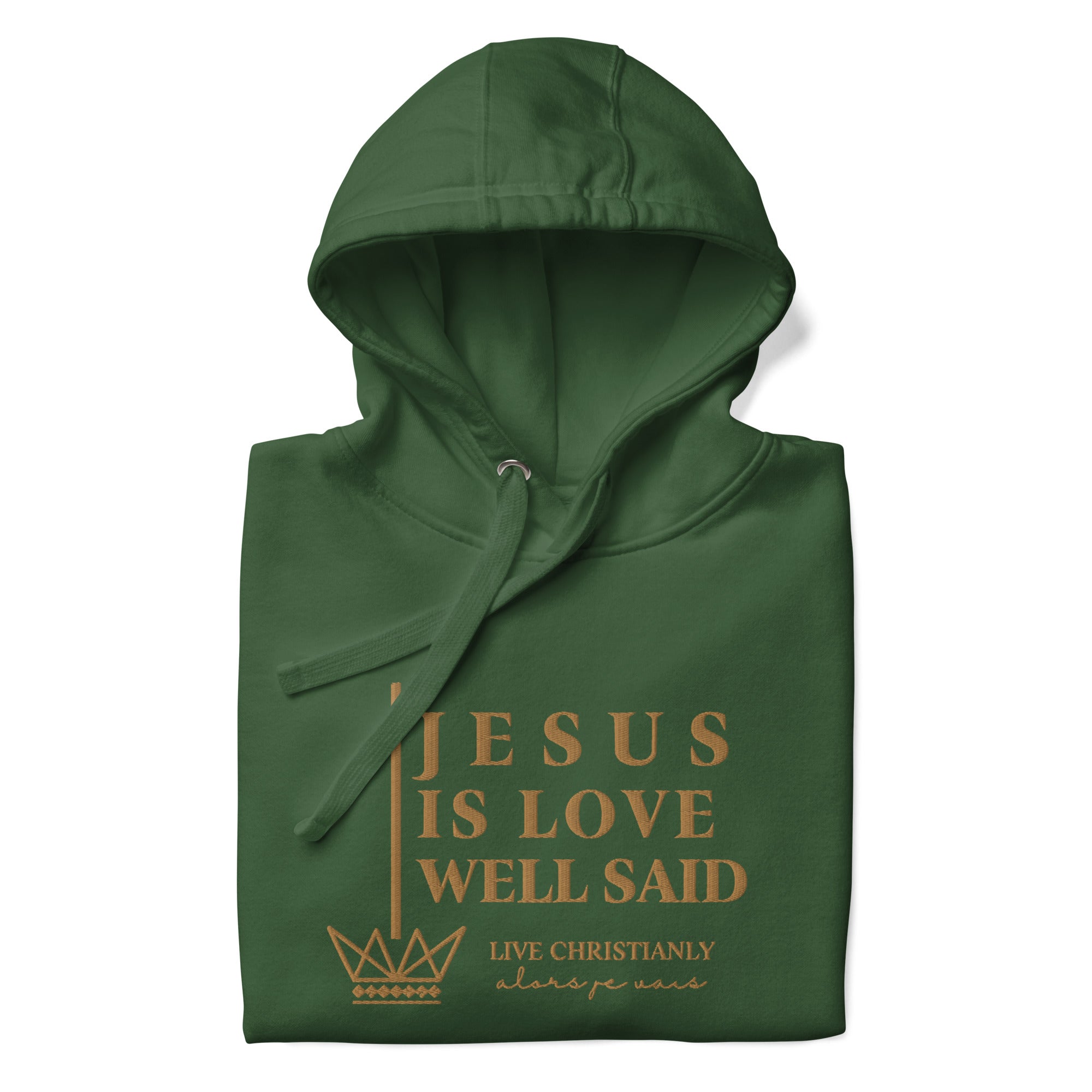 The luxurious way to show off your faith. Wrap yourself in the ultimate comfort and style with our 'JESUS IS LOVE WELL SAID Hoodie'. Perfect for any occasion, this hoodie serves as a reminder of your devotion while elevating your wardrobe. Crafted with the highest quality materials, it's a must-have for any fashion-forward believer; a product loved by those with discerning taste.in the warmth of love and tranquility that only comes from loving Jesus.