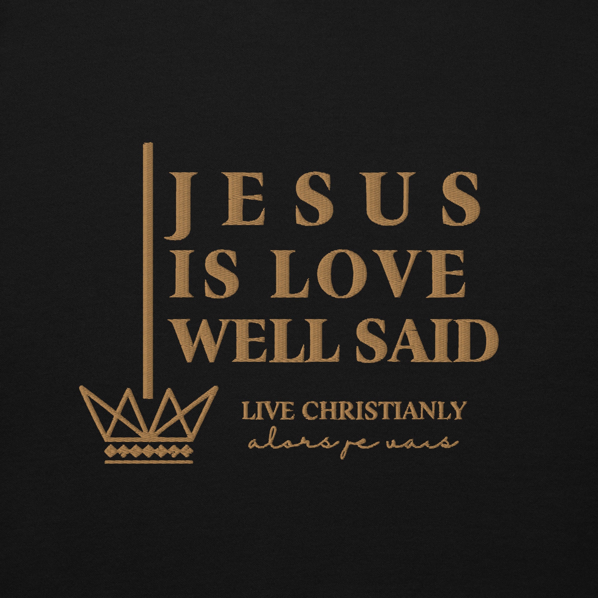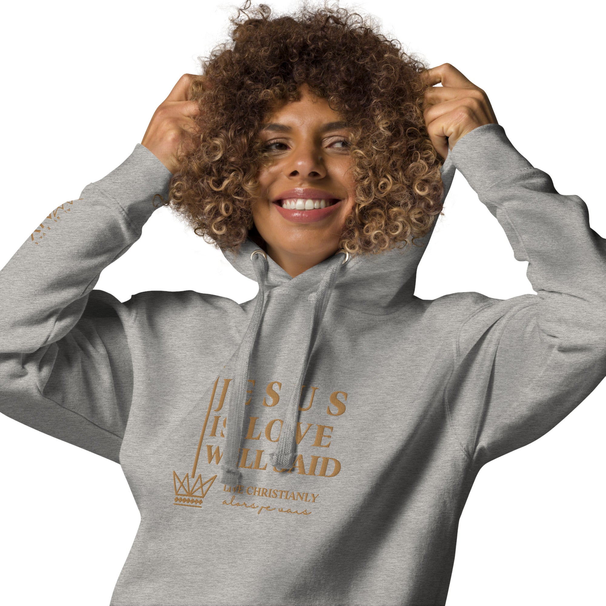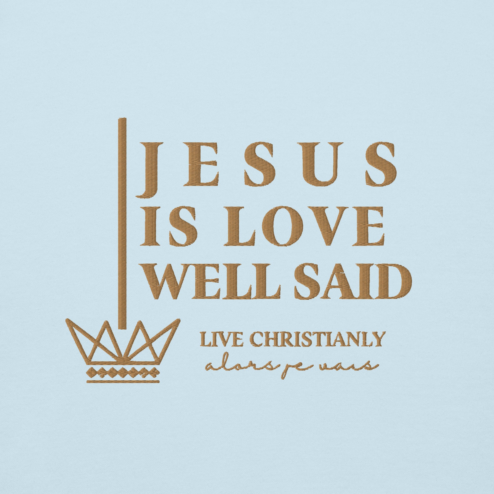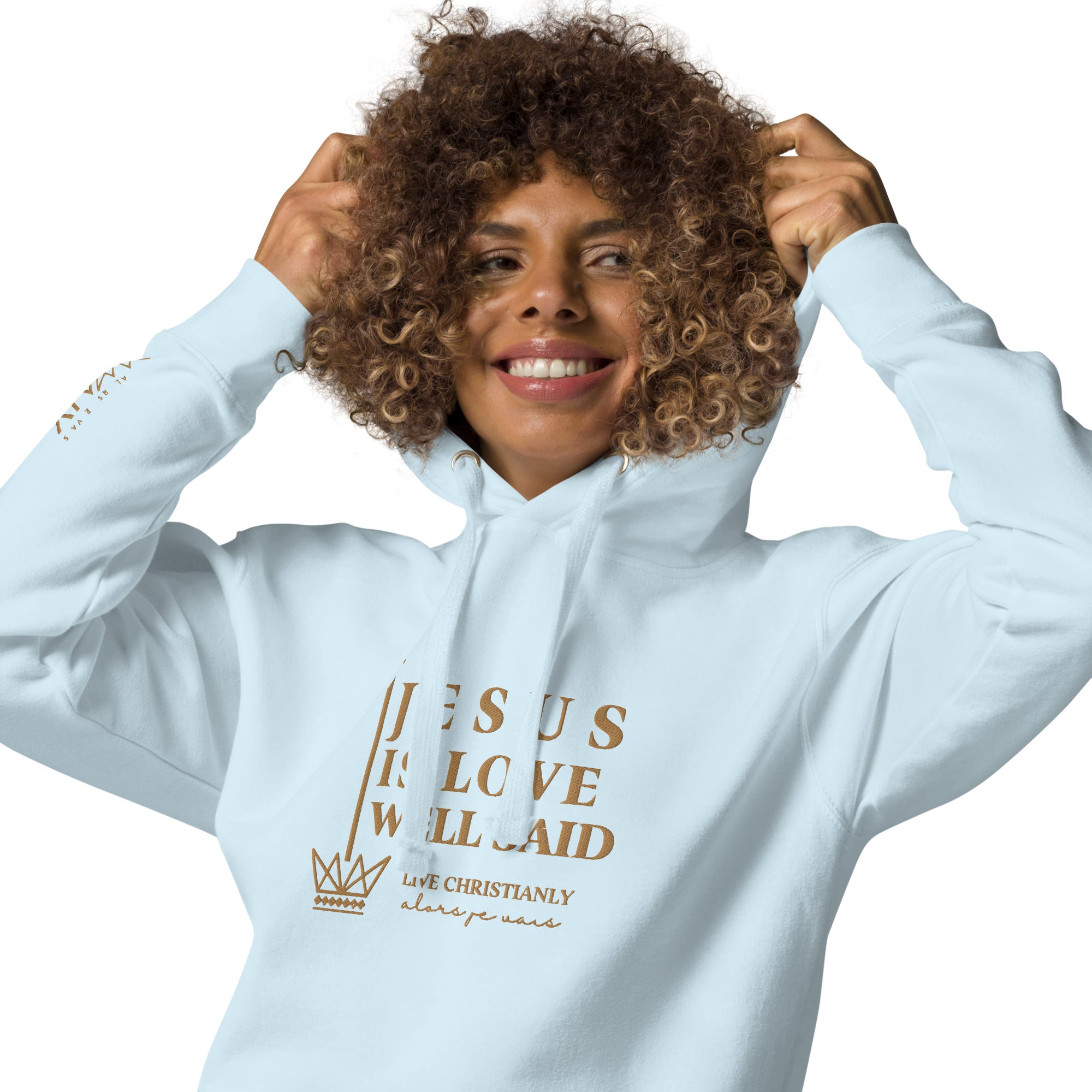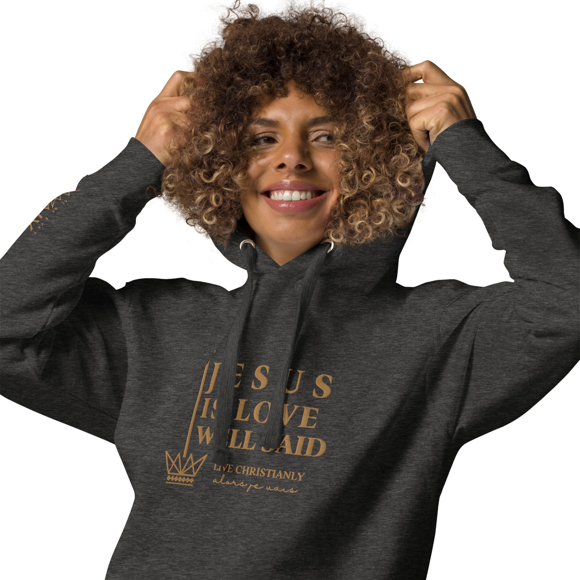 The luxurious way to show off your faith. Wrap yourself in the ultimate comfort and style with our 'JESUS IS LOVE WELL SAID Hoodie'. Perfect for any occasion, this hoodie serves as a reminder of your devotion while elevating your wardrobe. Crafted with the highest quality materials, it's a must-have for any fashion-forward believer; a product loved by those with discerning taste.in the warmth of love and tranquility that only comes from loving Jesus.
