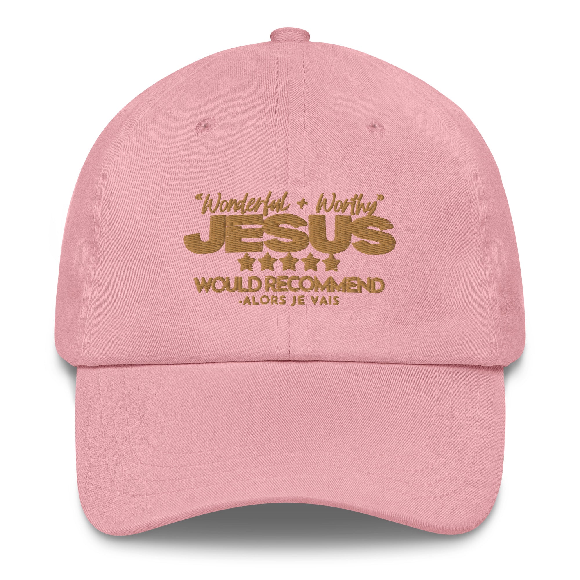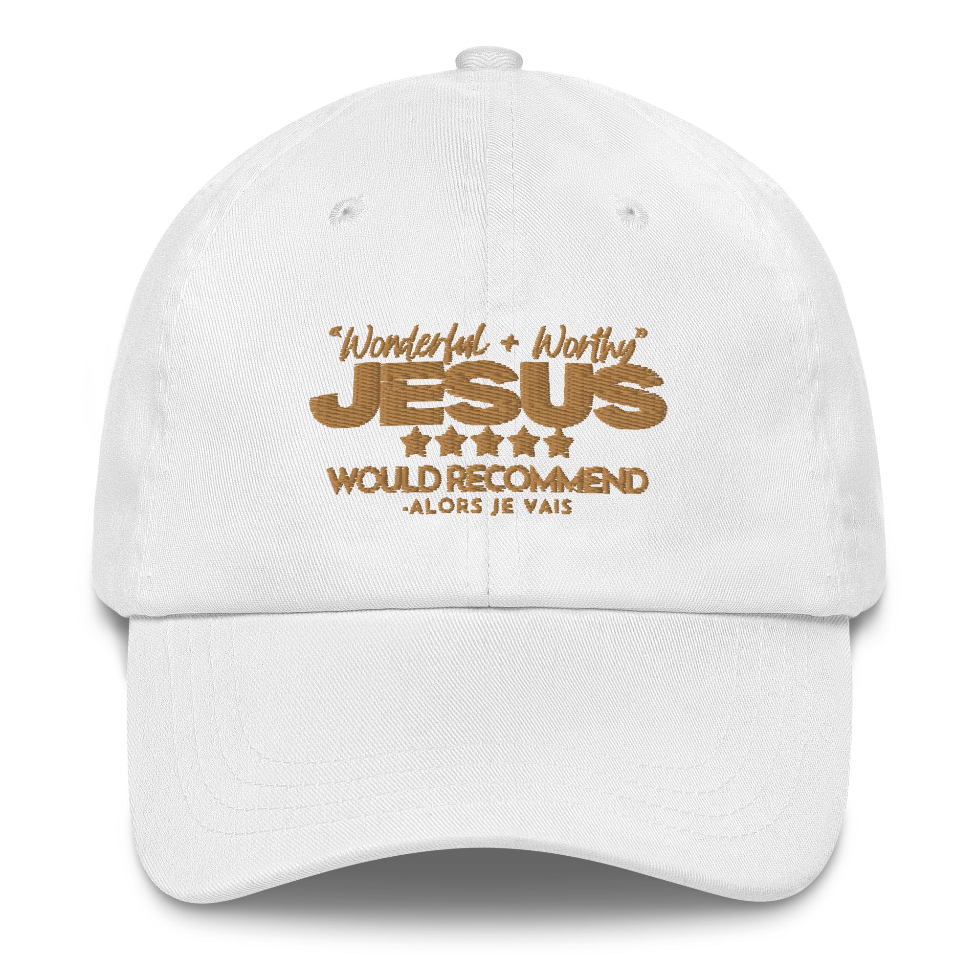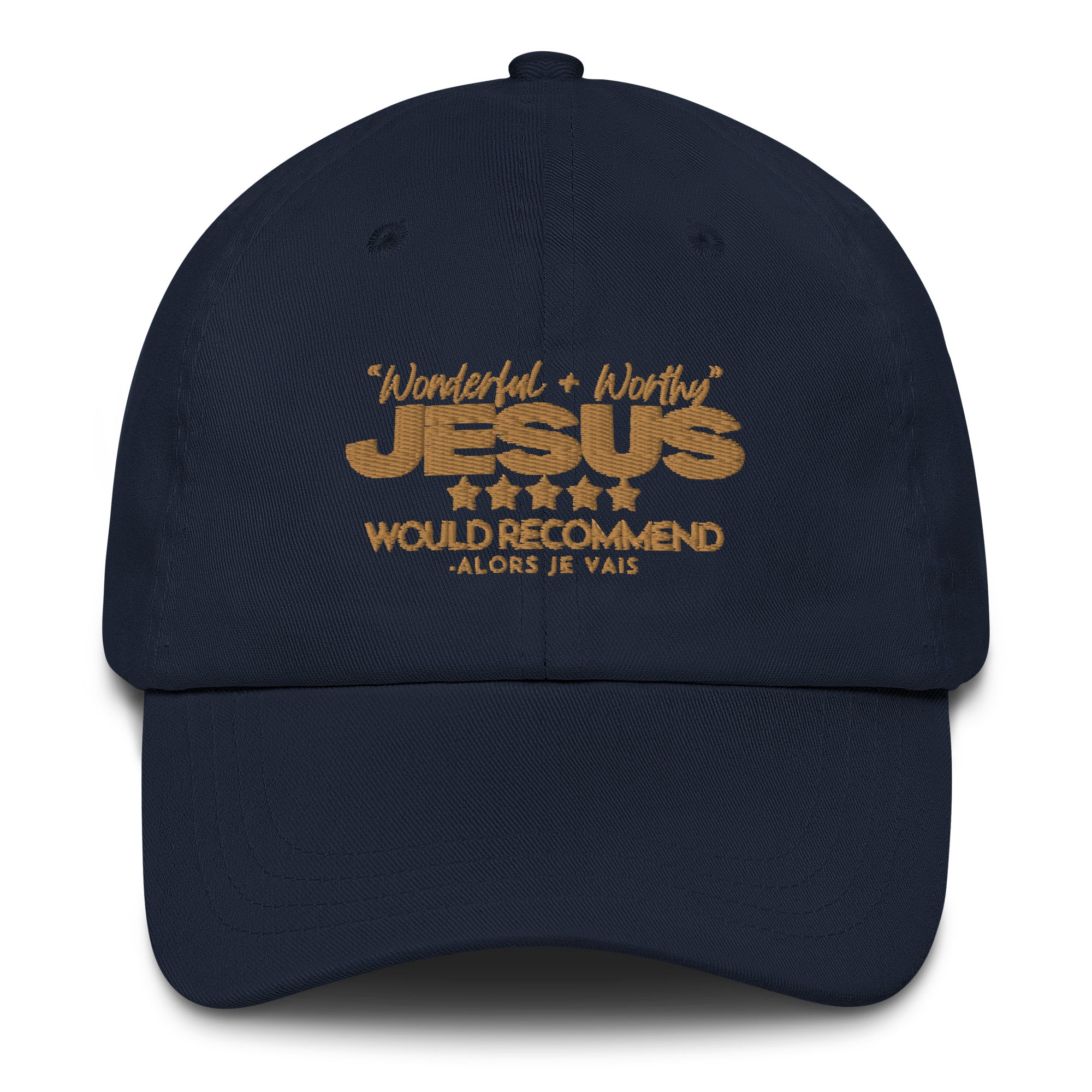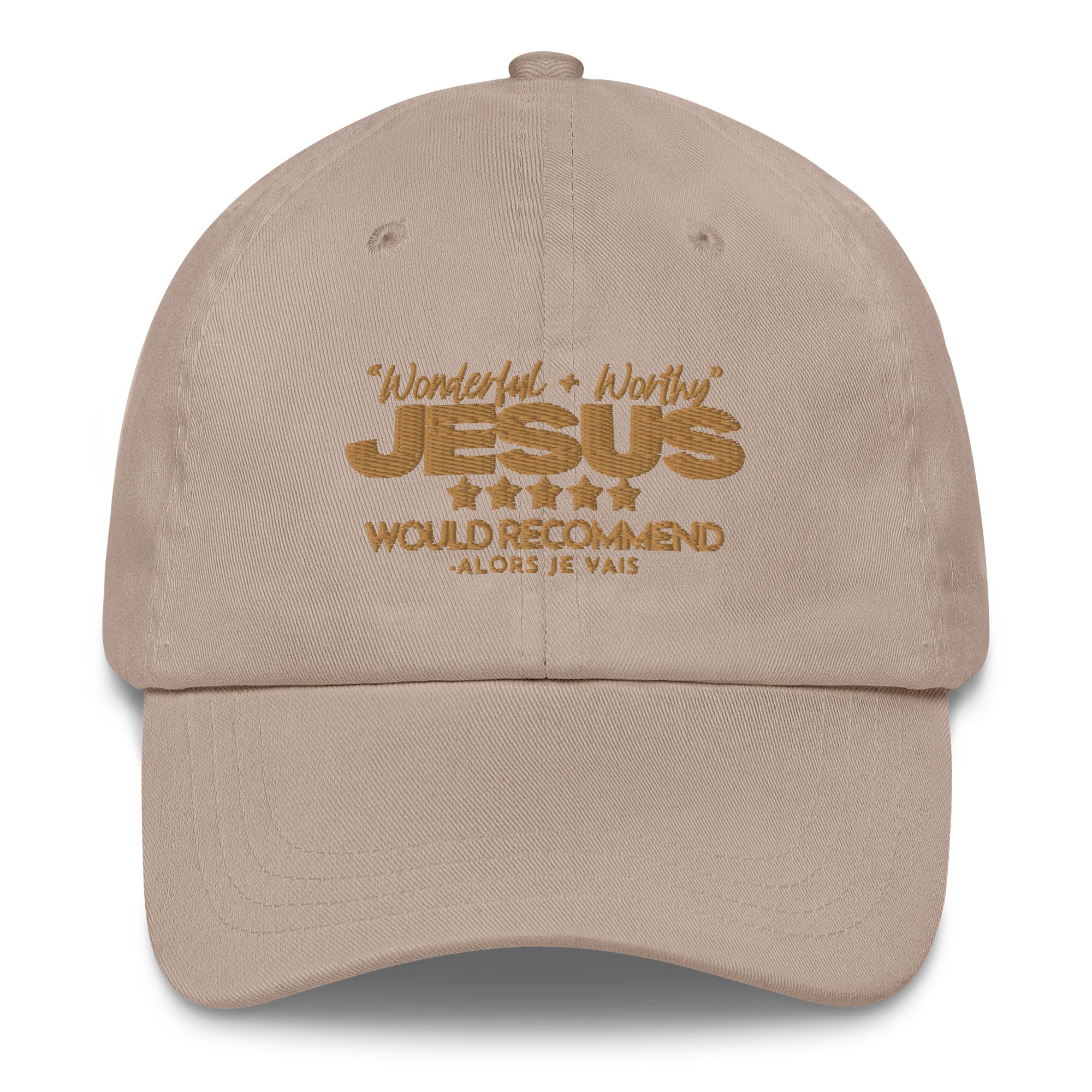 ALORS JE VAIS’ JESUS WONDERFUL AND WORTHY Discover a truly remarkable hat, crafted with timeless style and undeniable quality with a message for the ages. Elevate your wardrobe with this exclusive accessory, fit for the sophisticated individual who appreciates the finer things in life. Experience its unique charm and feel the comfort, showing off who you know is truly worthy.