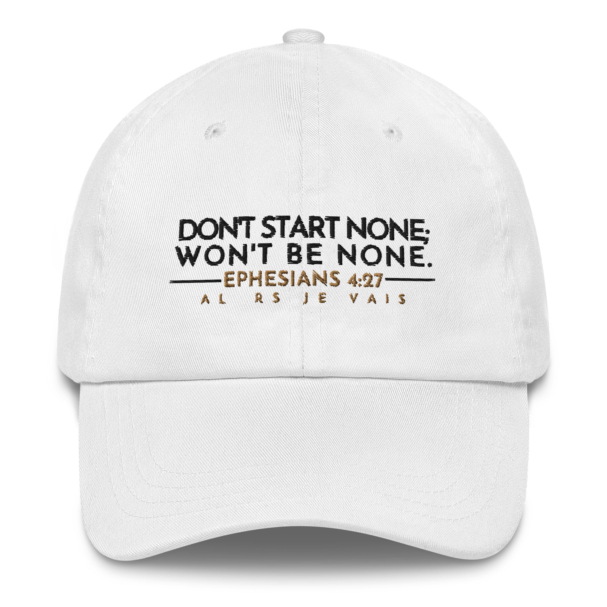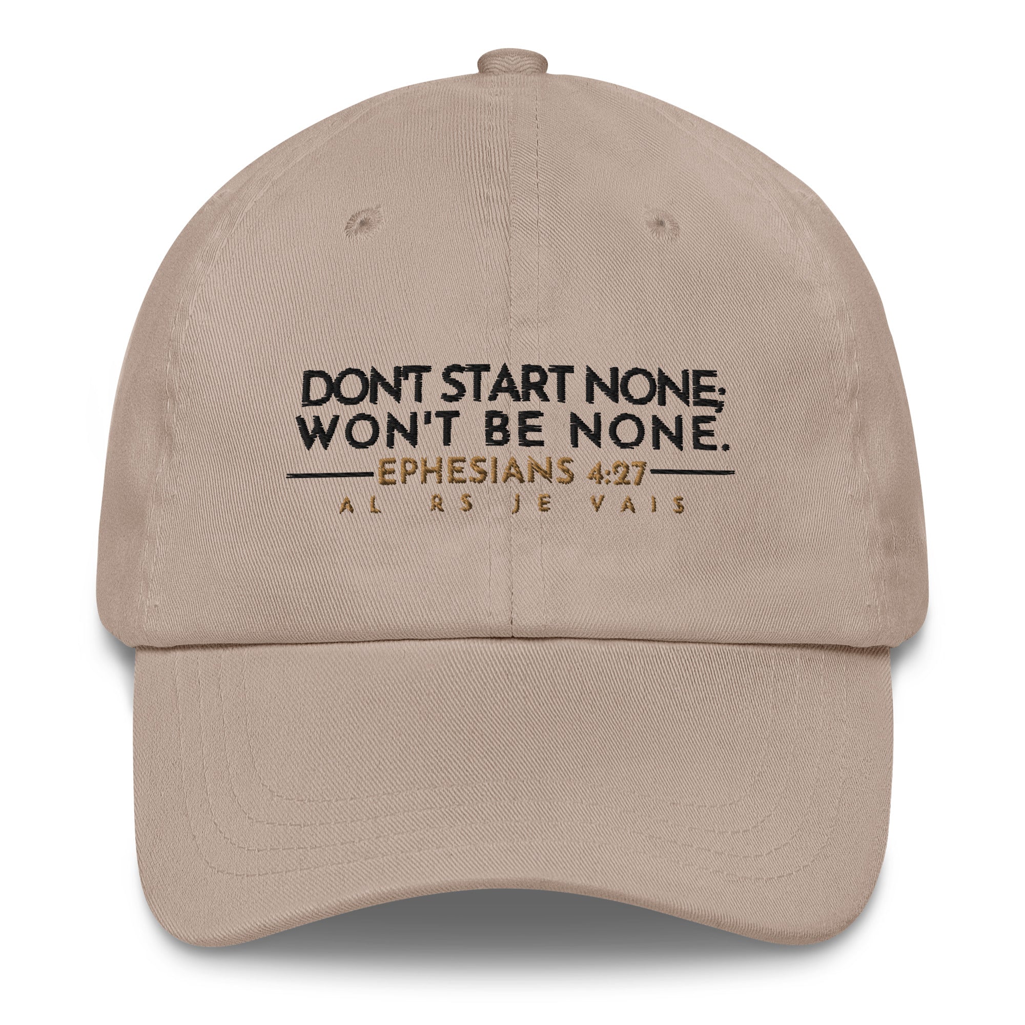 Make a bold statement with the ALORS JE VAIS' DON'T START NONE - WONT BE NONE HAT. Designed for the Christian who exudes confidence and refuses to engage in drama or navigate purposefully into trouble. This hat serves as a reminder to rise above, be authentic, and stay true to your King. Elevate any outfit with this exclusive piece. Made with premium materials and features intricate embroidery.